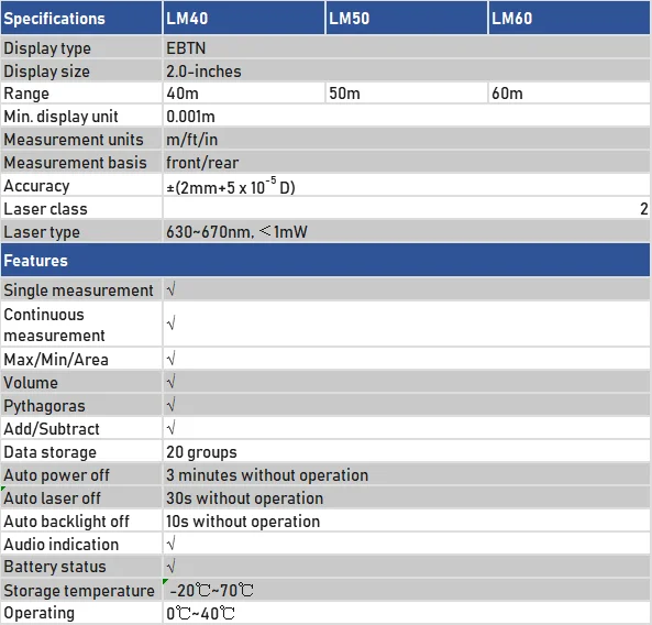 Применение: Его можно использовать в дизайне интерьера/экстерьера, строительстве, заводском наблюдении, инженерных инспекциях, сборе доказательств дорожных аварий, развитии недвижимости, оценке пожаров и многого другого. 1. Эргономичный внешний вид, удобная обработка 2. Точность миллиметра 3. Большой, широкоугольный HD дисплей 4. Быстрый автоматический расчет с индикацией в реальном времени 5. Физический выравниватель 6. Несколько функций: максимальное/минимальное/Непрерывное измерение, расчет смещения, хранение данных и многое другое 7. Автоматическое выключение через 3 минуты без работы Технические характеристики LM50 Тип дисплея EBTN Размер дисплея 2,0-дюйм (ов) Диапазон 50 м Мин. Дисплей 0,001 м Единицы измерения M/ft/in Основа для измерения Передняя/задняя Точность ±(2 мм + 5x10-5D) Лазерный класс 2 Тип лазера 630 ~ 670нм, 670нм 1 мВт Особенности Единичное измерение И radic; Непрерывное измерение И radic; Макс/мин/площадь И radic; Объем И radic; Пифагоры И radic; Добавить/вычесть И radic; Хранение данных 20 групп Автоматическое отключение питания 3 минуты без работы Автоматическое лазерное выключение 30s без работы Автоматическое выключение подсветки 10s без работы Аудиоиндикация И radic; Дисплей состояния батареи И radic; Температура хранения -20 ℃ ~ 70 ℃ Рабочая температура 0 ℃ ~ 40 ℃