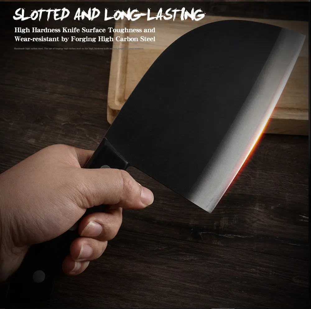 Китайский кухонный нож, кованый вручную, Длина лезвия: 17 см, ширина: 10 см, вес: около 440 г. Толщина клинка: 5 мм. Изготовлены из марганцевой стали, рукоять и лезвие интегрированы без пайки, что является твердым и долговечным для устранения сломанной ручки. Благодаря отличной жесткости Передняя 3/4 часть подходит для шинковки, а задняя 1/4 часть подходит для раскроя.