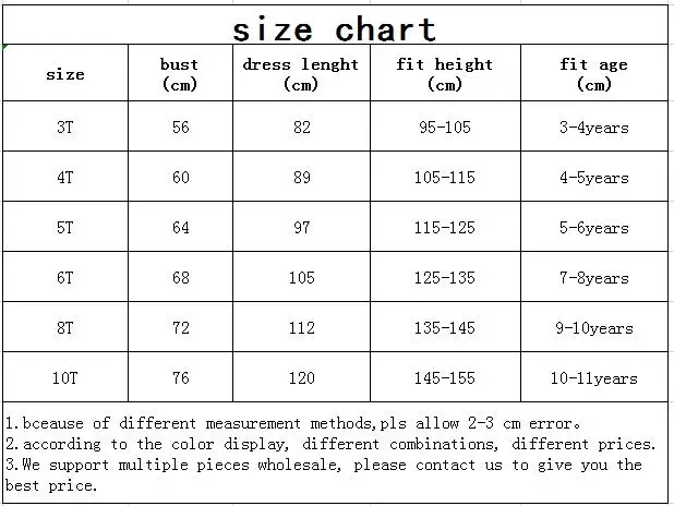 Description5 размеров в наличии: размер 3T подходит на рост 95-105 см; Размер 4T подходит на рост 105-115 см; Размер 5T подходит на рост 115-125 см; размер 6T подходит для роста 125-135 см; Размер 8T подходит для роста 135-145 см; Размер 10T подходит для роста 145-155 см; Пожалуйста, выберите правильный размер для вашего роста. Если ваша принцесса весит больше вашего обычного тела, пожалуйста, выберите больший размер