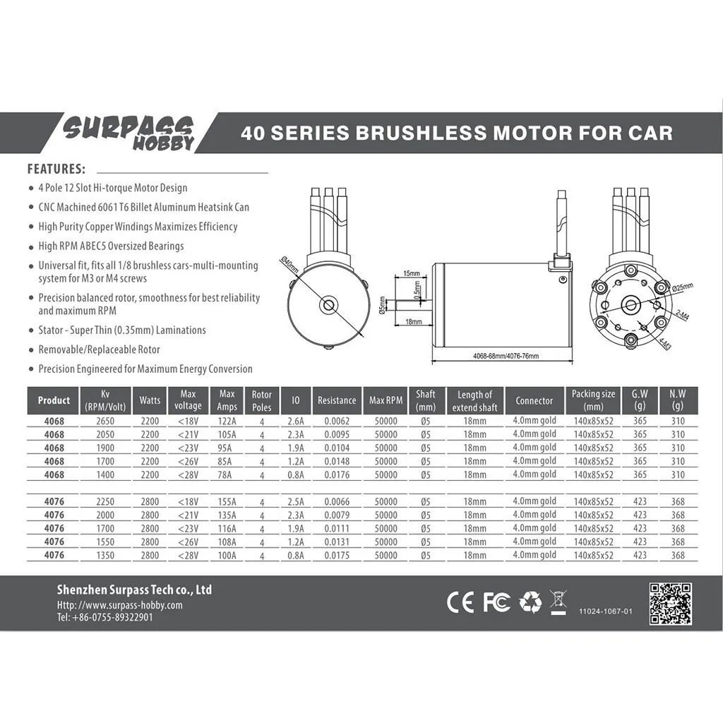 SURPASS HOBBY водонепроницаемый бесщеточный двигатель 4068 2650KV для 1/8 RC автомобиля грузовика 2/3/4S