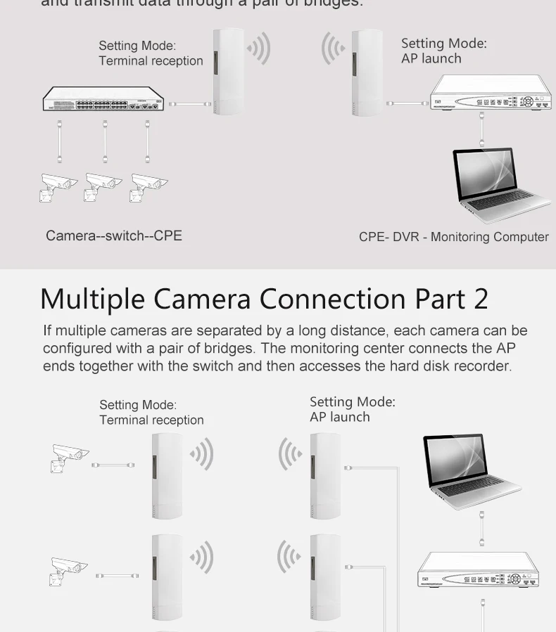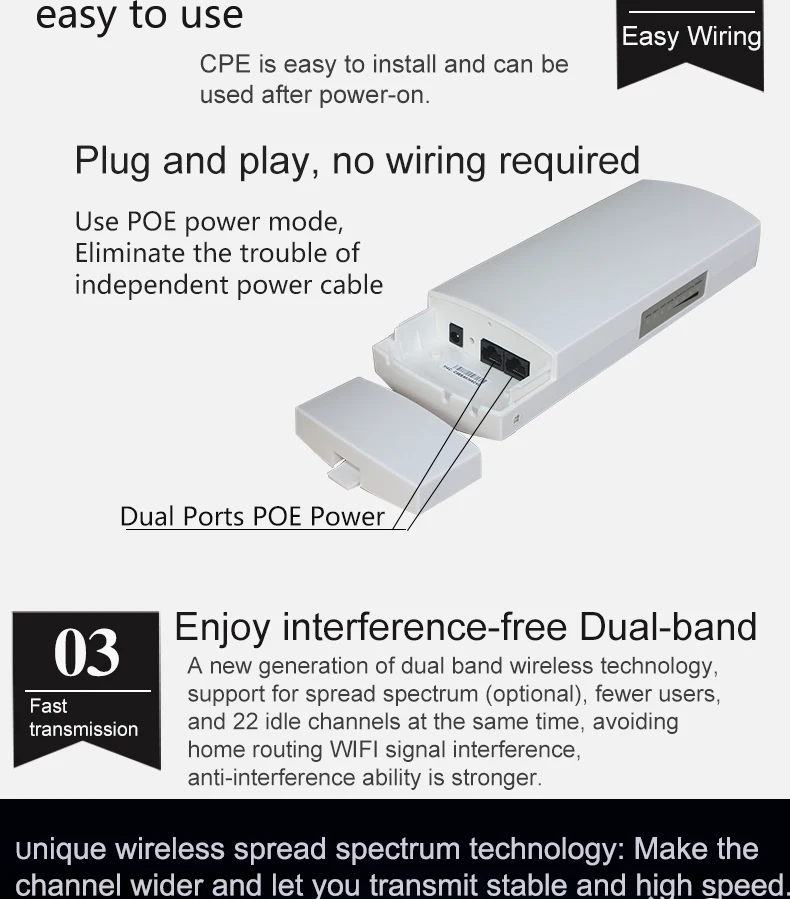 1.CPE046 Беспроводной Wi-Fi репитер-это высокомощный маршрутизатор с 5.8b наружного и внутреннего мост беспроводного доступа в Интернет и 802.11b / g / n стандарт Wi-Fi 450 Мбит/с высокой скоростью в 5,8, оснащен двумя 10 / 100M LAN портов, что в два раза больше, чем данных через Ethernet 3. Беспроводной ретранслятор делает его доступным для более чем 20 конечных пользователей, чтобы насладиться бесшовные HD фильмы, потоковый медиа, онлайн-игр, Беспроводной безопасности и другие полосы пропускания-интенсивные задачи. 4. Передача данных к удаленному точка-точка или точка-Многоточечное соединение. Он поддерживает 1-2 км (максимальное) дальность передачи и двунаправленный движения до 300 м. 5.CPE046 cpe маршрутизатор с интеллигентая (ый) функцию управления сетью, может автоматически пара. Характеристика * 200 МВт высокой мощности, встроенный 12dBi MIMO Беспроводная плоская панельная антенна, более сильный сигнал, прочность и больше беспроводное покрытие * Встроенный брандмауэр, ip-фильтре, url-фильтре и фильтре MAC • Совместим со стандартами IEEE 802.3az стандарт, технологии beamforming, регулировка мощности RF и частотный анализатор, может быть лучше применяется в различных средах * Поддержка DDNS, VPN сквозной, порт пересылки и хост-хост * Поддерживает 64 / 128-bit WEP, 128-бит WPA (TKIP / AES) безопасности Чипсет: AR9531 Флэш-память * DDR2: флеш-память 8 МБ * DDR2 память 64 Мб, Заводская пломба Интерфейс: 10 / 100 Мбит/с WAN * 1 LAN * 1 Мощность питания: POE 24V 1A Диапазон частот: 2300 ~ 2800 МГц Направление поляризации: Горизонтальная и вертикальная Коэффициент усиления антенны: 12DBi Telnet: Поддержка Контроль mac-адреса: Поддержка WEP-управления: Поддержка Шифрование: WEP Шифрование 64/128 бит, WPA, WPA2, 802.1x Рабочая температура: -30 ~ 70 ℃ Температура хранения: -30 ~ 65 ℃ Влажности (неконцентрированном): le95 %