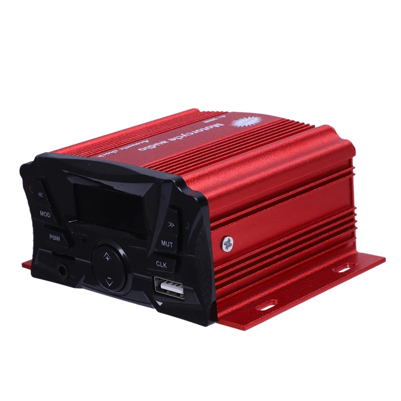 3,5 мм аудиоразъем AUX в наличии. Поддержка USB и Micro-SD карты MP3 файлов. Поддержка USB зарядки. Fm-радио. Часы Дисплей. Идеально подходит для мотоцикла ATV UTV Электрический велосипед Морской лодки