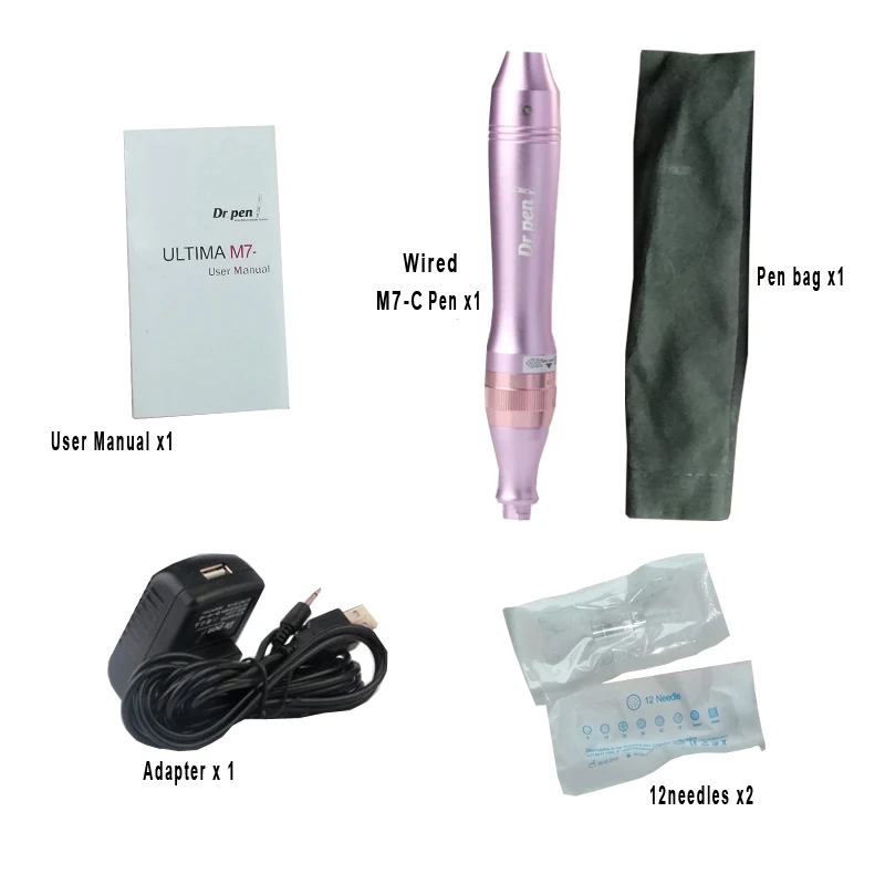Dr.Pen Ultima M7-C (розовый) Высокоскоростная Дерма-ручка 13000 об/мин для регулярного отшелушивания кожи, уменьшения тонкой линии и пигментации и увеличения поглощения питательных веществ. Подходит для лица, глаз и шеи. Поставляется в привлекательной компактной коробке для хранения. Упаковочный лист: 1 x часть руки Адаптер-1 шт. Руководство пользователя-1 шт.; 1 x Мощность кабель 2 x иглы картридж (12 контактов) можно изменить на другие иглы, просто оставьте комментарий для нас, какую иглу вы хотите. Технические характеристики: Модель: Dr.pen M7-C проводная Скорость двигателя: Макс 13000RMP Материал: металлический розовый корпус Скорость: 5 уровней Размеры: 147x24mm Мощность питания: адаптер Сертификат: CE, ISO13485:2016 Обслуживание: заказанный логотип доступен для оптовых заказов Преимущества Короткие сроки заживления. Визуальное и заметное улучшение в течение нескольких дней с первого лечения. Никаких постоянных повреждений или травм. Отсутствие синяков, инфекции, обесцвечивания или других осложнений. Чрезвычайно высокая абсорбция любых активных ингредиентов. Почти все типы кожи могут быть обработаны. Утолщает кожу без повреждения или удаления эпидермиса.