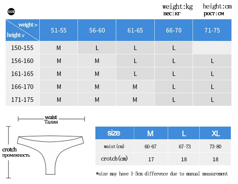Размер: M L XL Материал: хлопок, спандекс, нейлон Посылка включает в себя: pantiesx3 Тип размера: Азиатский размер. Пожалуйста, выберите на один размер больше вашего обычного размера. Примечания: 1. Из-за различных настроек монитора и освещения фактический цвет изделия может немного отличаться от цвета, показанного на фотографиях. Спасибо! 2. Замеры сделаны вручную, поэтому возможны отклонения на 1-3 см.