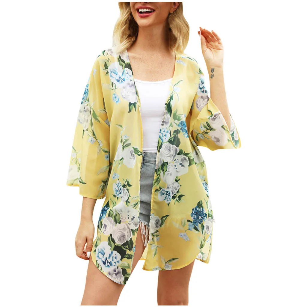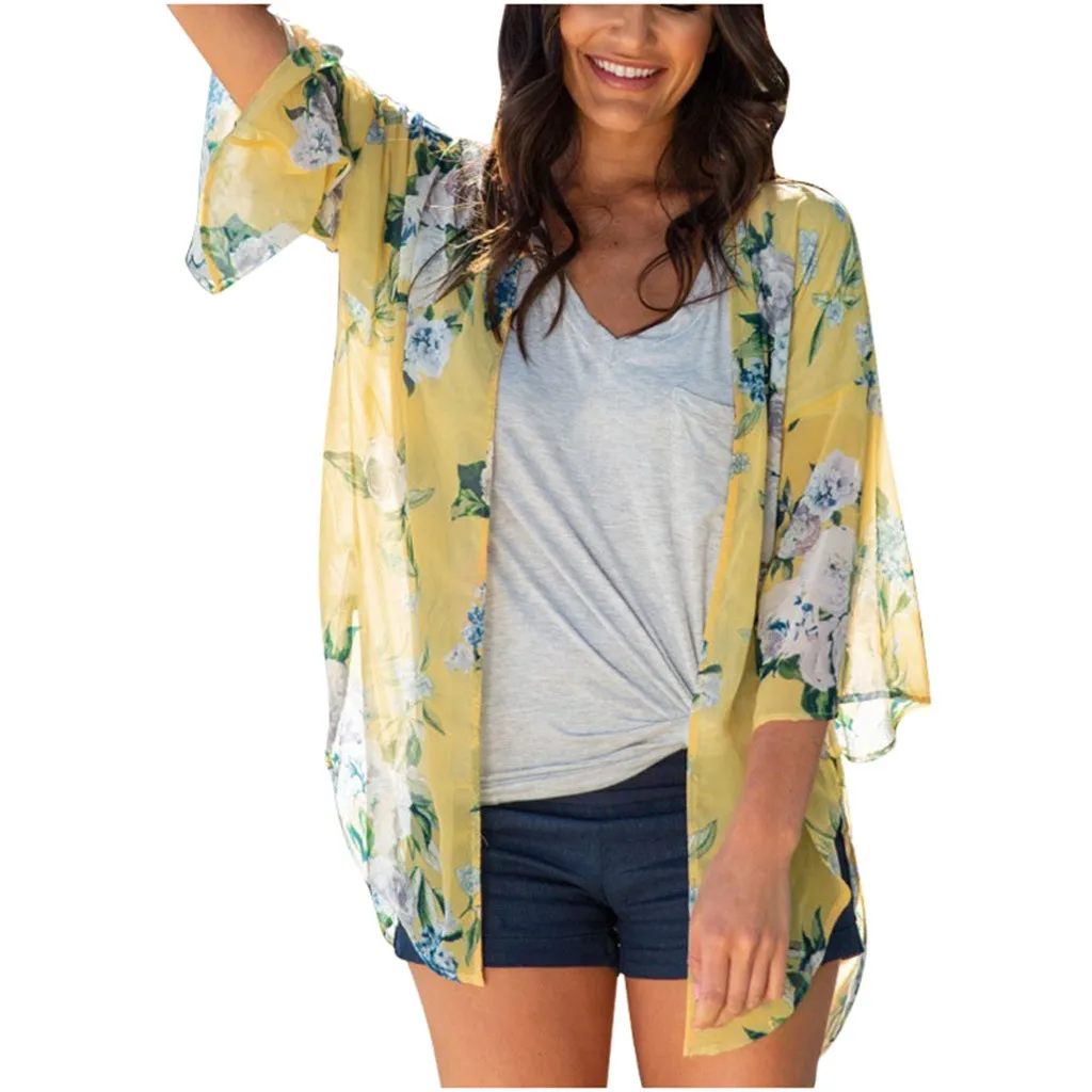Стиль: идеально подходит как уличная одежда, пляжная одежда, одежда для отдыха, повседневное кимоно, Пляжный купальный костюм накидка, модная шифоновая блузка, сексуальный пляжный чехол Топ, тонкое пальто на весну, лето, осень и т. д. Универсальный гардероб Штапель как для жарких дней на улице, так и для холодного кондиционирования воздуха в помещении