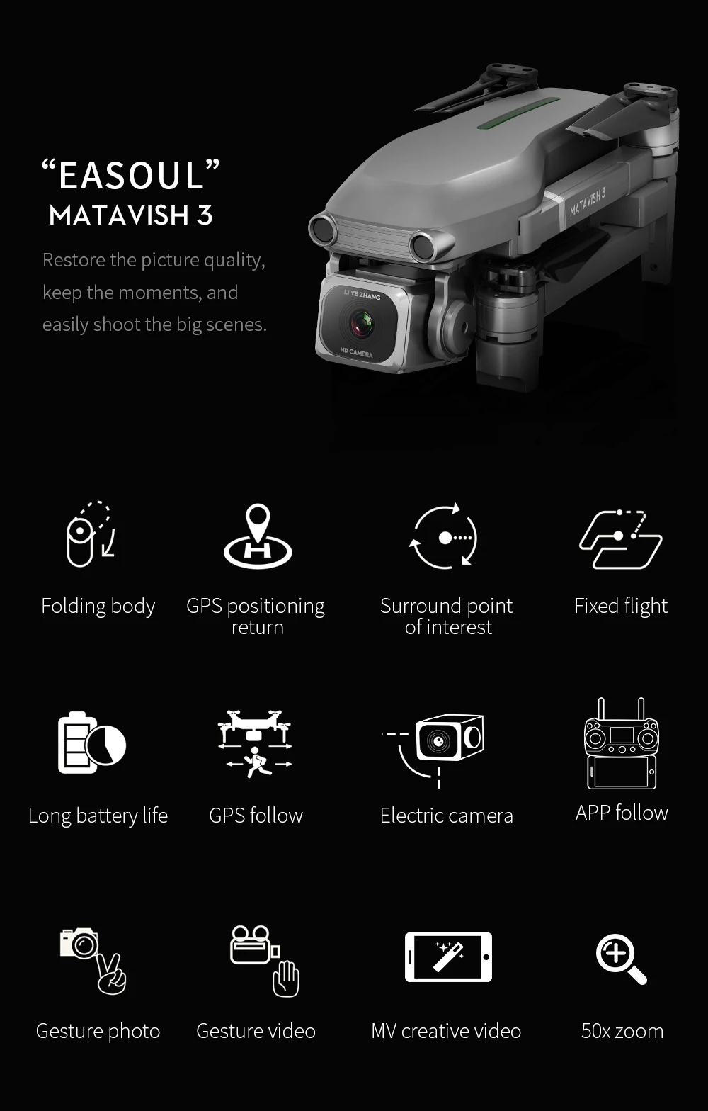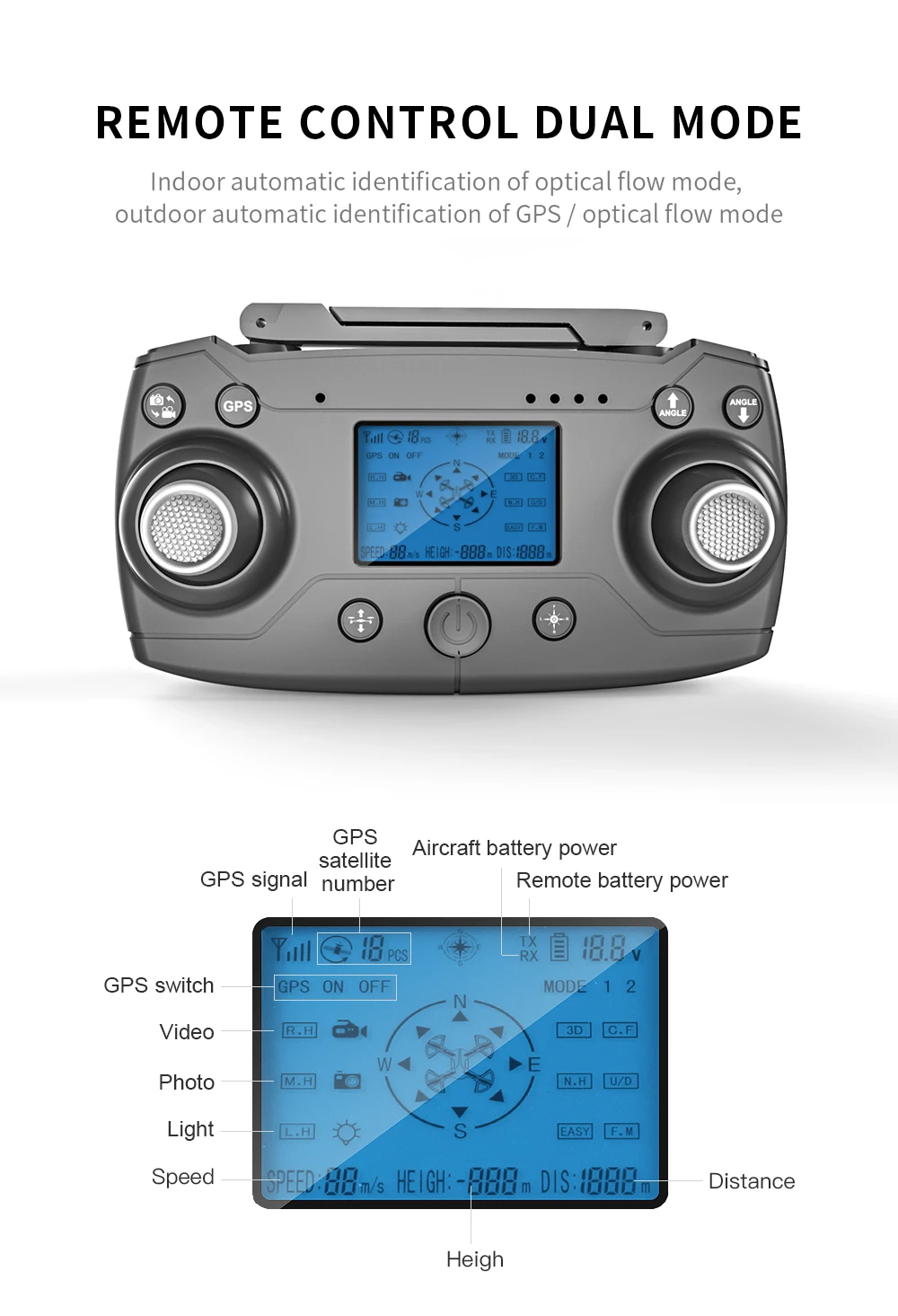 Функция: 5G Wi-Fi FPV, ESC камера, приложение управления полетом, GPS автоматическое возвращение, режим следования за мной, режим высоты, режим полета путевой точки, оптическое позиционирование потока, фиксированная точка окружения, жест фото/видео, видео, «Безголовый» режим фиксированное hover, 2-х уровневые полета регулировки скорости, одна кнопка для взлёта и посадки, один ключ возврата