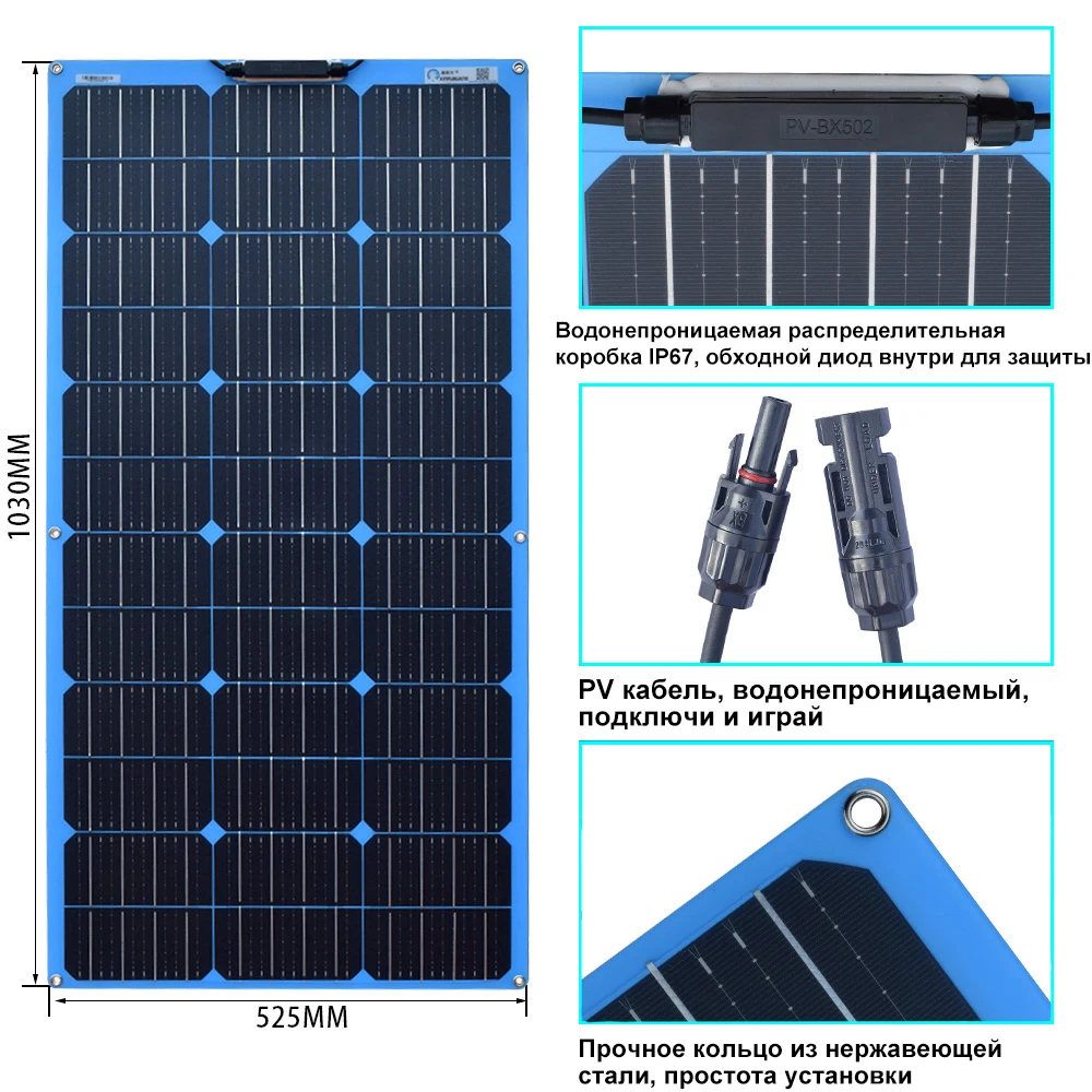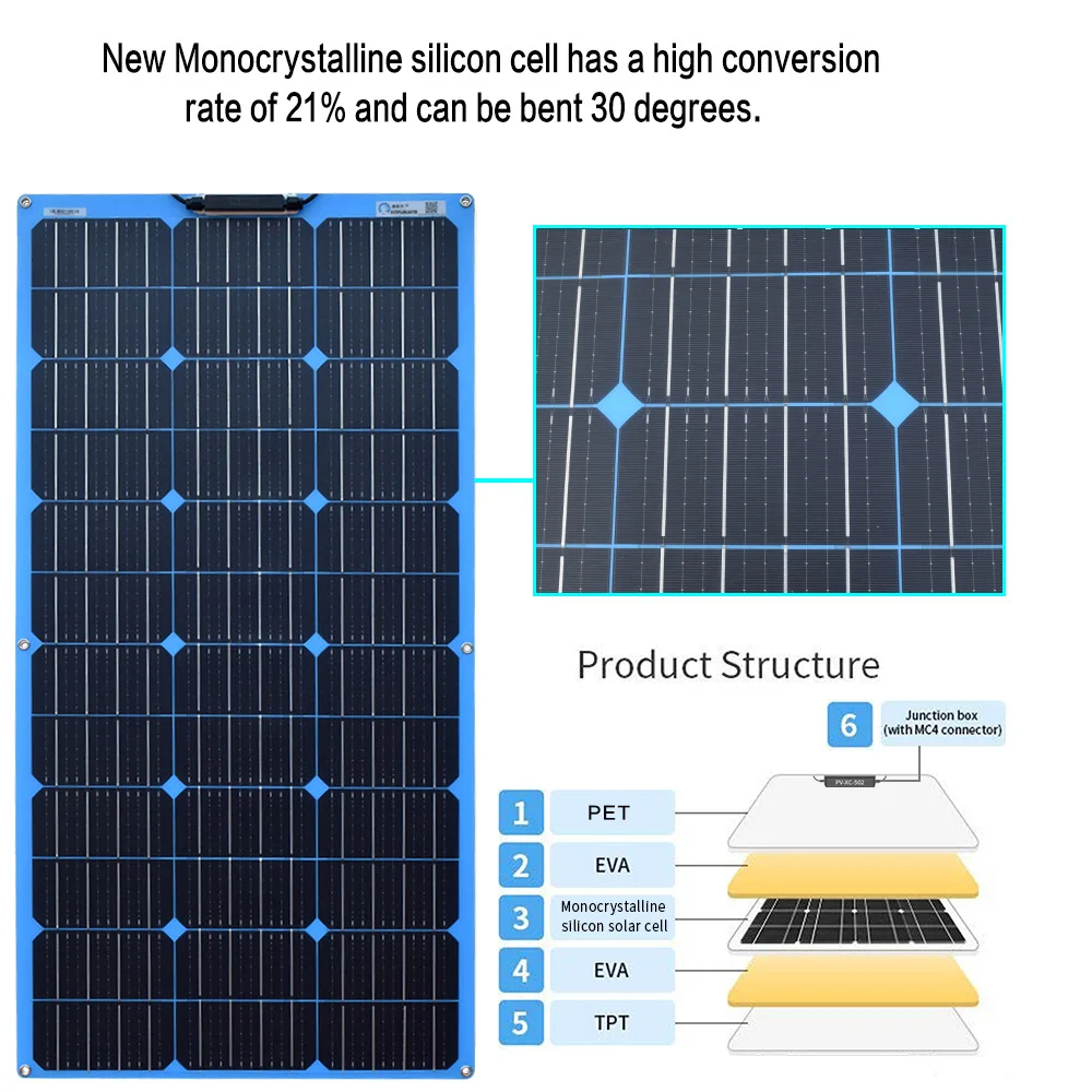 а. высокоэффективные монокристаллические кремниевые солнечные элементы размером 161 * 161 мм: эффективность выработки электроэнергии примерно в 1,3 раза выше, чем у обычного поликремния, а общая площадь при той же мощности меньше. б. Использование новейших технологий упаковки компонентов, тоньше, легче, мягче и дольше. с. Поверхность изготовлена из ПЭТ и обработана специальным способом, который является более износостойким и улучшает эффективность поглощения солнечного света. д. С высоким коэффициентом пропускания света, безопасно и надежно, не боится высокой температуры, нет опасности возгорания или взрыва. е. Распределительная коробка имеет водонепроницаемый дизайн IP67, содержит обходной диод, а схема имеет конструкцию защиты от перезаряда и обратного тока. е. Используйте специальный фотоэлектрический кабель и разъем MC4, наружное использование является безопасным, водонепроницаемым, устойчивым к высоким температурам и погодным условиям. Разъем MC4 прост в использовании, подключи и играй. г. Этот продукт является солнечным модулем. Рекомендуется использовать с контроллерами и батареями. Он может использоваться в различных сценариях, таких как домашние хозяйства, кемпинг, фургоны, яхты, уличные фонари и солнечная электростанция