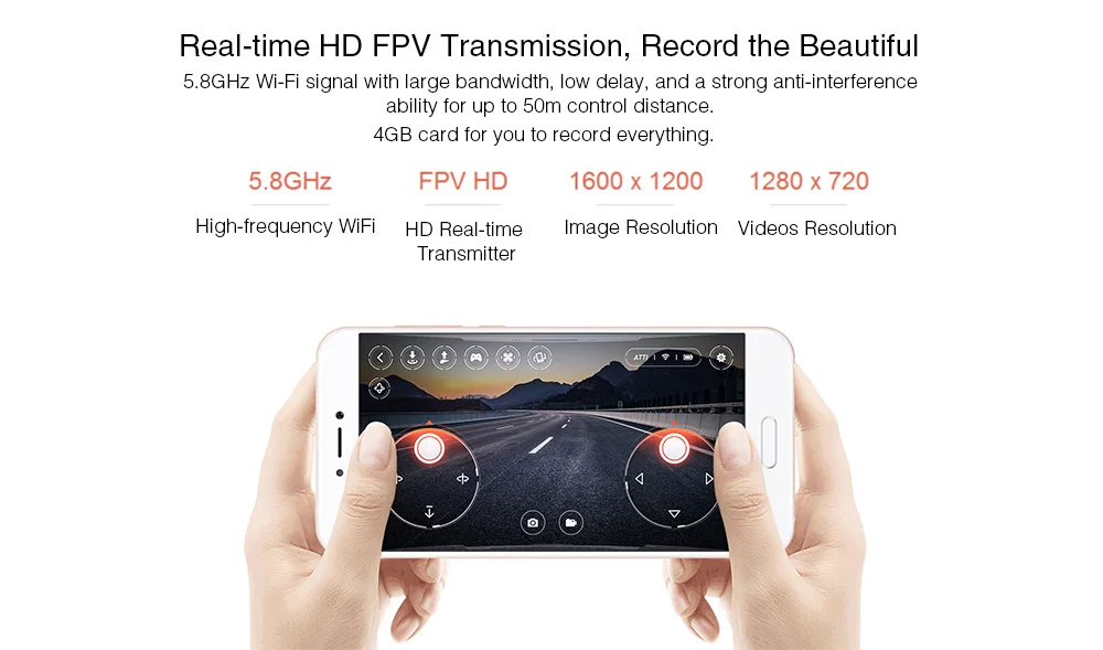 Встроенный 720P камера настроена удивительно, чтобы запечатлеть фотографии и видео с неба и дает FPV передача в режиме реального времени.