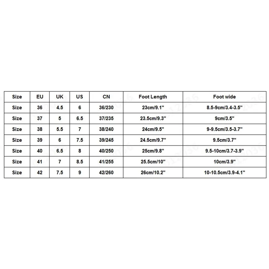 Посылка:1 пара женской обуви(Не включая коробку для обуви) Размер США Великобритания ЕС CN Длина стопы Широкая стопа 36 6 4 35,5 230 23 см/9,1" 8,5 см/3,4 дюйма 37 6,5-7 4,5 36 235 23,5 см/9,3 дюйма 8,5-9 см/3,4-3,5 дюйма 38 7,5 5 37 240 24 см/9,5 дюйма 9 см/3,5 дюйма 39 8 5,5 38 245 24,5 см/9,7 дюйма 9-9,5 см/3,5-3,7 дюйма 40 8,5 6 39 250 25 см/9,8 дюйма 9,5 см/3,7 дюйма 41 9 6,5 39,5 255 25,5 см/10" 9,5-10 см/3,7-3,9 дюйма 42 9,5-10 7 40 260 26 см/10,2 дюйма 10 см/3,9" Размер: 36 США: 6 Великобритания: 4 ЕС: 35,5 CN:230 Длина стопы: 23 см/9,1 дюйма Ширина стопы: 8,5 см/3,4 дюйма Размер: 37 США: 6,5-7 Великобритания: 4,5 ЕС: 36 CN:235 Длина стопы: 23,5 см/9,3 дюйма Ширина стопы: 8,5-9 см/3,4-3,5 дюйма Размер: 38 США: 7,5 Великобритания: 5 ЕС: 37 CN:240 Длина стопы: 24 см/9,5 дюйма Ширина стопы: 9 см/3,5 дюйма Размер: 39 США: 8 Великобритания: 5,5 ЕС: 38 CN:245 Длина стопы: 24,5 см/9,7 дюйма Ширина стопы: 9-9,5 см/3,5-3,7 дюйма Размер: 40 США: 8,5 Великобритания: 6 ЕС: 39 CN:250 Длина стопы: 25 см/9,8 дюйма Ширина стопы: 9,5 см/3,7 дюйма Размер: 41 США: 9 Великобритания: 6,5 ЕС: 39,5 CN:255 Длина стопы: 25,5 см/10 дюймов Ширина стопы: 9,5-10 см/3,7-3,9 дюйма Размер: 42 США: 9,5-10 Великобритания: 7 ЕС: 40 CN:260 Длина стопы: 26 см/10,2 дюйма Ширина стопы: 10 см/3,9 дюйма