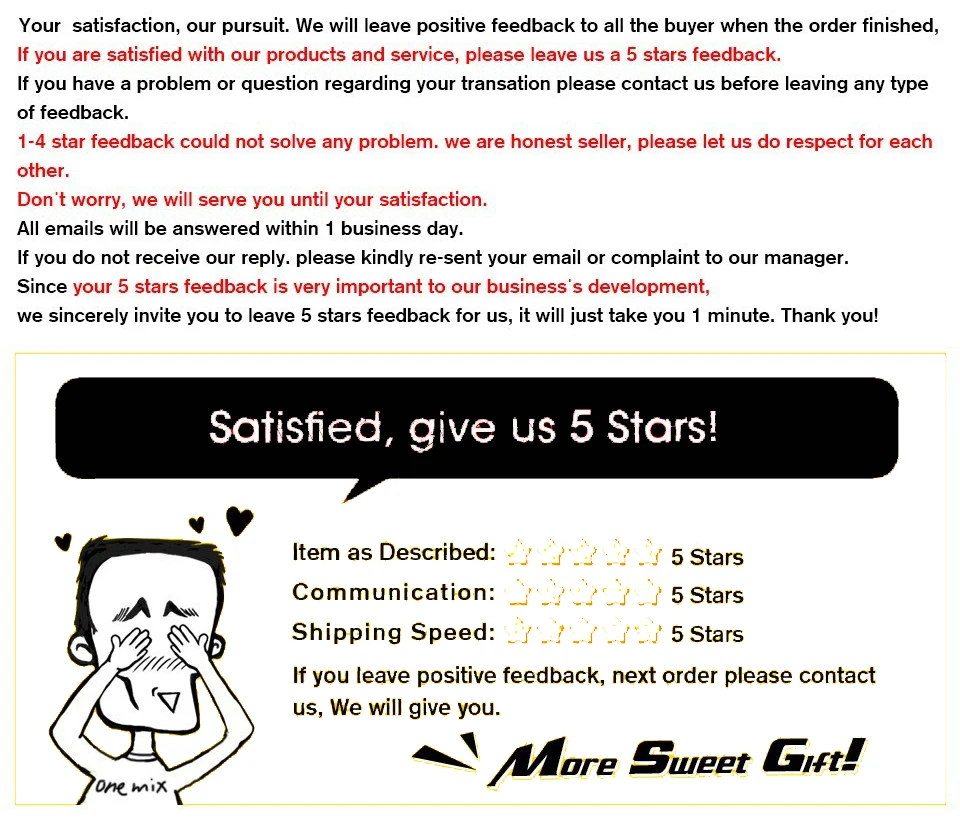Если вы получили товар и обнаружили, что он имеет проблемы, сначала не оставляйте комментарий и отзывы, сначала свяжитесь с нами, и мы приложим все усилия, чтобы решить все проблемы для вас.