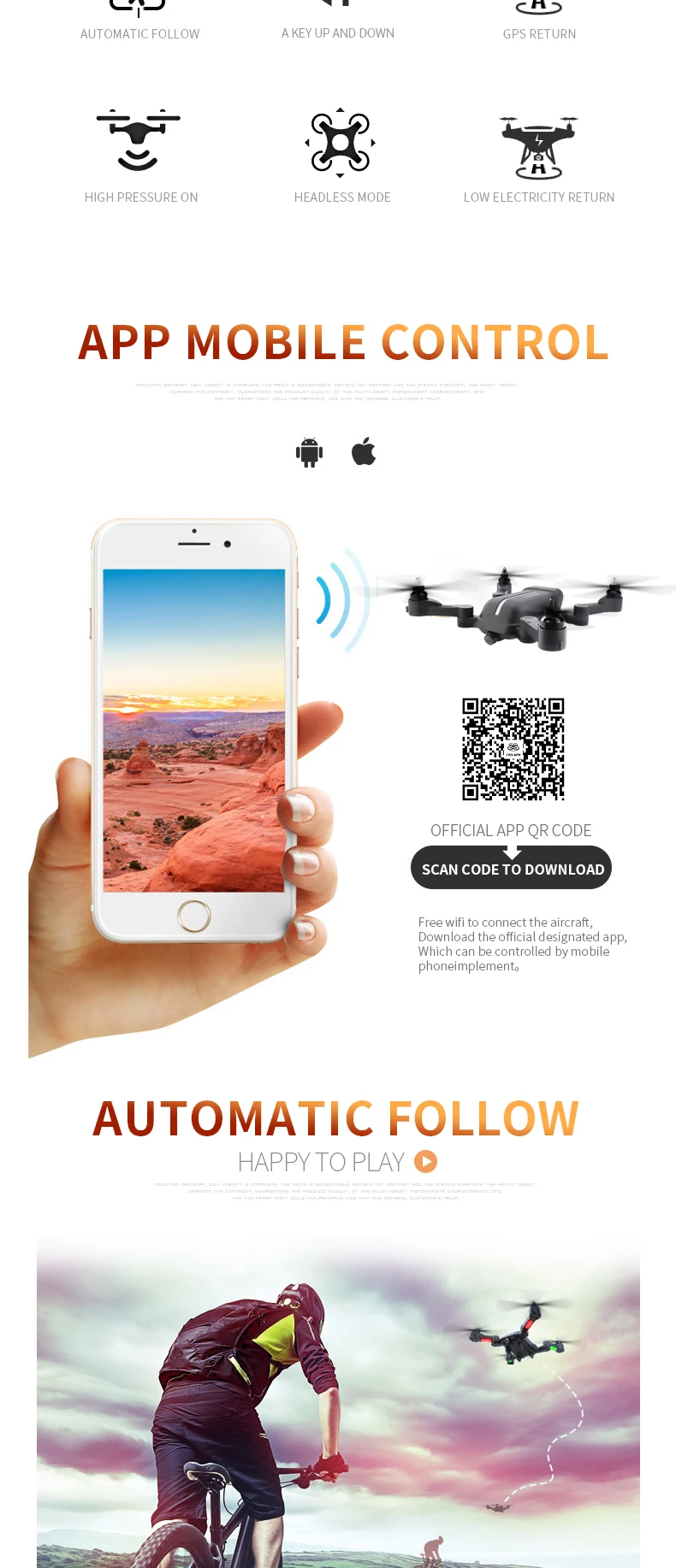 1. Система GPS, разработанная для определения местоположения дрона. Теперь вам не нужно беспокоиться о том, что Дрон улетит. 2. Интеллектуальное возвращение GPS: одна кнопка автоматически возвращается в точку снятия, низкое напряжение управления полетом автоматически возвращается в точку снятия, сигнал дистанционного управления не возвращается автоматически в точку снятия. 3. Позиционирование GPS, один ключ фиксированной высоты, один ключ функции посадки. 4. Умное следующее: камера автоматически выравнивает и выравнивает ракету, куда идти и куда идти, чтобы наслаждаться полетом, и съемка дает вам различный опыт. 5. Функция объемного звучания: центрируется вокруг положения колебания тока самолета, вращается вокруг радиуса: 5.10.20 метров на выбор. 6.HD камера: 5G WIFI 4K камера высокой четкости, 120 ° HD широкоугольная камера, встроенная камера и дизайн корпуса, легко снимать фотографии и видео с высоким разрешением 7. Бесщеточный двигатель с сильной мощностью для квадрокоптера, может летать в ветрах класса 7 8. Расстояние дистанционного управления: в пределах 2000 метров; Расстояние передачи изображения: в пределах 800 метров (без помех, без препятствий)