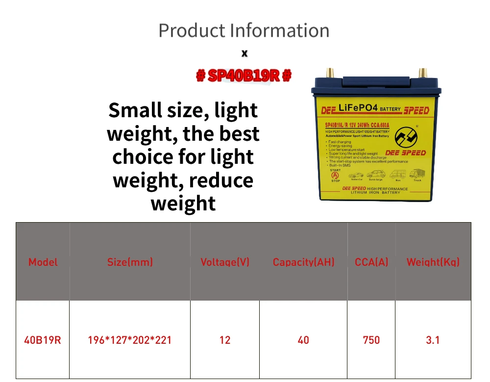 Мы предлагаем литиевые, lifepo4 и Ni-MH батареи, принимаем Индивидуальные батареи, мы не можем обновить все товары здесь. Если какой-либо аккумулятор вы хотите, пожалуйста, не стесняйтесь связаться со мной, скажите мне напряжение и размер, которые вы хотите, спасибо. Описание: Номинальное напряжение: 12 В Номинальная мощность: 40Ah CCA:750A Срок службы: более 2000 циклов Температура зарядки: 0 ~ 45 ℃ Температура разряда: -20 ~ 60 ℃ Температура хранения: -20 ~ 45 ℃ Вес: 3,1 кг Размер: 196*127*202*221 мм Диапазон рабочего напряжения: 14,6-10 в Защита от избыточного заряда благодаря напряжение: 14,6 V + 0,05 V Предохранение от перенапряжения: 10V + 0,05 V Защита от температуры батареи: 60 ℃ ± 5 ℃ Выход и параметры: высокая сила тока Положительная/отрицательная Соединительная Колонка (красный положительный электрод, черный отрицательный полюс); Срок хранения батареи: 90% мощности (6 месяцев) Гарантия на батарею: 12 месяцев (бесплатная гарантия) Посылка включает в себя: 1 Аккумулятор Lifepo4 большой емкости. BMS построить в ней 2 изделия ручной