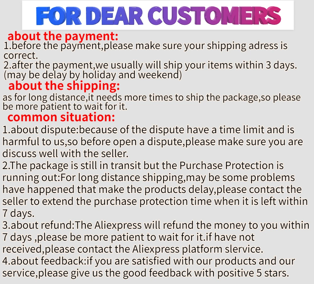 Если вы удовлетворены нашей работой и продуктами, пожалуйста, оставьте нам пять звезд, отзывы и расскажите своим друзьям; Если нет, пожалуйста, свяжитесь с нами, прежде чем оставлять негативные отзывы. Мы можем работать вместе, чтобы разрешить любой спор. Ваше удовлетворение является нашим главным приоритетом. Добро пожаловать в наш магазин!