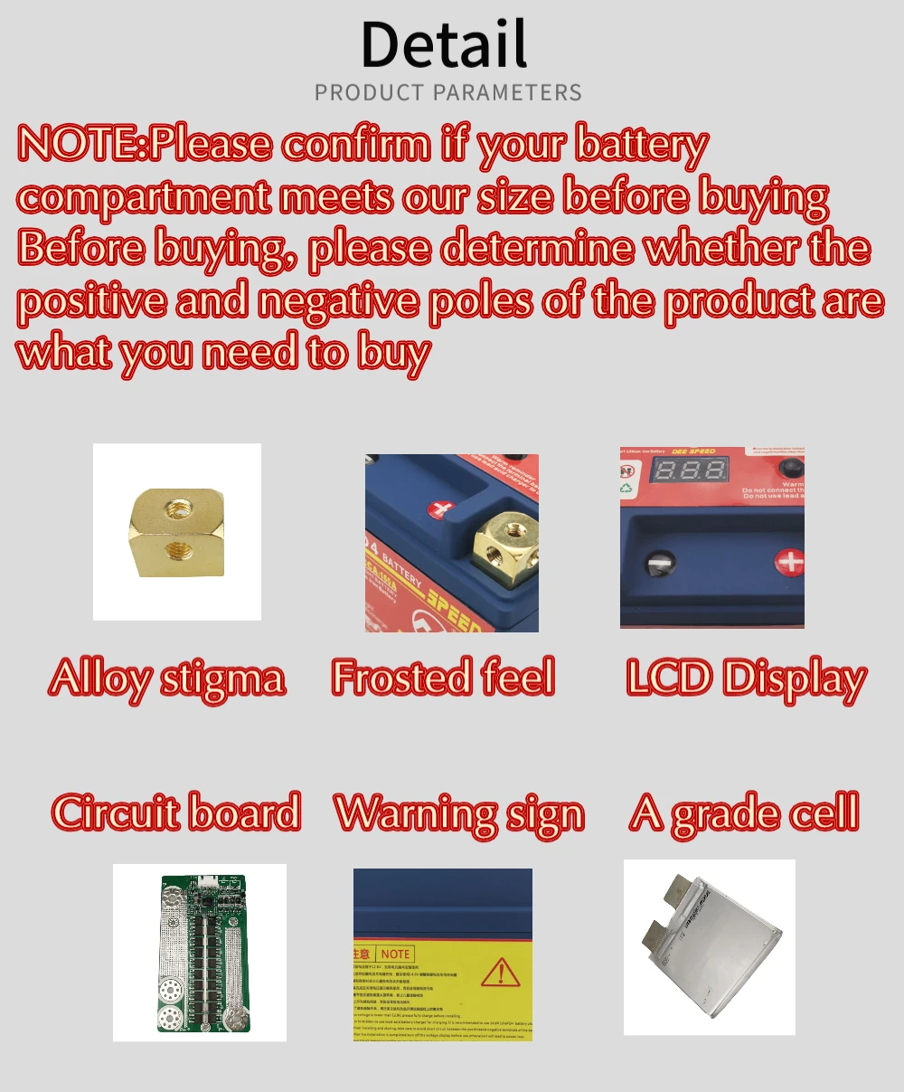 1. Пожалуйста, сообщите нам, какой бренд и модель вашего мотоцикла, мы порекомендуем подходящие модели для вас. 2. Перед установкой и использованием убедитесь, что вся электрическая система мотоцикла является нормальной (Е. g. Выпрямитель, Магнето и есть ли утечка электричества) и избегайте доставки в оба конца, вызванной возвратом товаров, кроме батареи, перед проблемами качества. 3. Пожалуйста, проверьте положительное и отрицательное направление оригинальной батареи перед покупкой, чтобы избежать ситуации, которая не может быть установлена после покупки. 4. Стандарты измерения свинцово-кислотных батарей и батарей lifepo4 отличаются, можно рассматривать как количество liftpo4, разделенное на два, что эквивалентно емкости свинцово-кислотных батарей. (Например, 4.5AH для батареи lifepo4 эквивалентен 9AH для свинцово-кислотной батареи, но пусковой ток такой же, как для свинцово-кислотных 9AH). 5. Если мотоцикл оснащен другими электрическими приборами, потребление электроэнергии будет зависеть, особенно GPS и сигнализация, что значительно повлияет на состояние ожидания литиевой батареи.