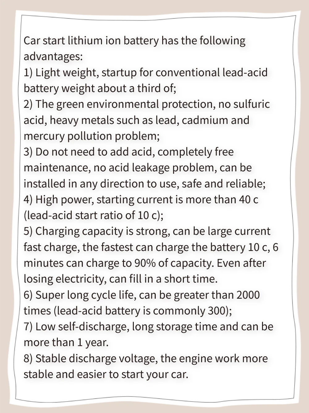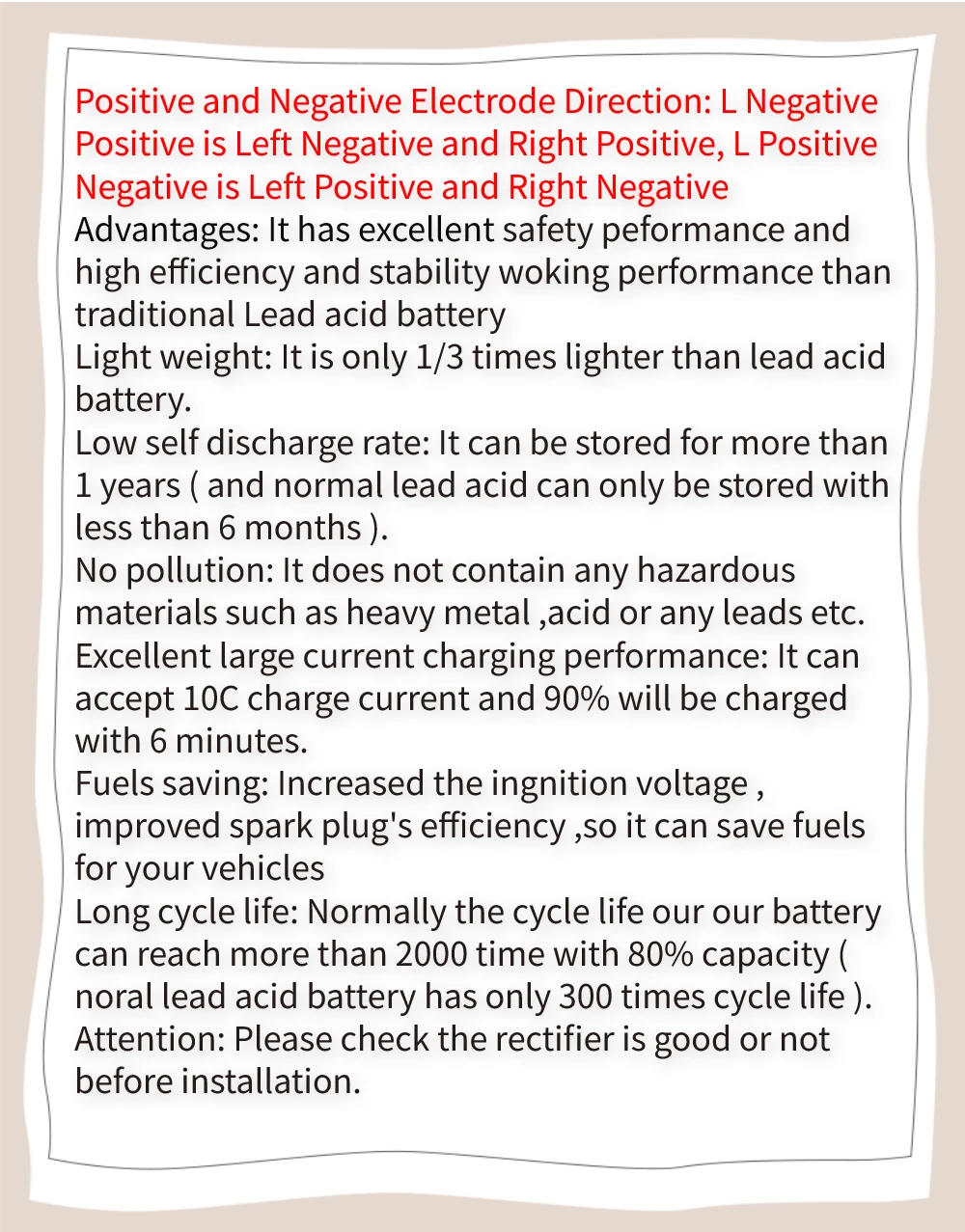 Преимущества: он имеет отличную безопасность и высокую эффективность и стабильность производительности, чем традиционные свинцово-кислотные батареи Вес светильника: светильник в 1/3 раза больше, чем свинцово-кислотный аккумулятор. Низкий уровень саморазряда: он может храниться более 1 года (и нормальная свинцовая кислота может храниться только менее 6 месяцев). Отсутствие загрязнения: он не содержит каких-либо опасных материалов, таких как тяжелые металлы, кислоты или любые провода и т. Д. Отличная большая производительность зарядки: он может принимать ток заряда 10 ℃ и 90% будет заряжаться за 6 минут. Экономия топлива: увеличение входного напряжения, повышение эффективности свечей зажигания, что позволяет экономить топливо для ваших автомобилей Длительный срок службы: как правило, срок службы нашей батареи может достигать более 2000 раз с емкостью 80% (свинцово-кислотная батарея noral имеет срок службы всего в 300 раз). Внимание: перед установкой проверьте правильность выпрямителя. Литиево-ионный аккумулятор для мотоцикла имеет следующие преимущества: 1) Вес светильника, запуск для обычных свинцово-кислотных аккумуляторов примерно на одну третью часть; 2) Экологическая защита, отсутствие серной кислоты, тяжелых металлов, таких как свинец, кадмий и ртутное загрязнение; 3) не нужно добавлять кислоту, полностью бесплатное обслуживание, отсутствие проблемы с утечкой кислоты, может быть установлен в любом направлении для использования, безопасный и надежный; 4) Высокая мощность, пусковой ток составляет более 40 ℃ (коэффициент запуска свинцово-кислотной кислоты 10 ℃); 5) Емкость Зарядки сильна, может быть большой ток быстрой зарядки, самый быстрый может заряжать аккумулятор 10 ℃, 6 минут может заряжать до 90% емкости. Даже после потери электричества, можно заполнить в течение короткого времени. 6) сверхдлительный срок службы, может быть больше 2000 раз (свинцово-кислотная батарея обычно 300); 7) Низкий саморазряд, длительное время хранения и может быть более 1 года. 8) стабильное напряжение разряда, двигатель работает более стабильно и проще, чтобы начать ваш мотоцикл.