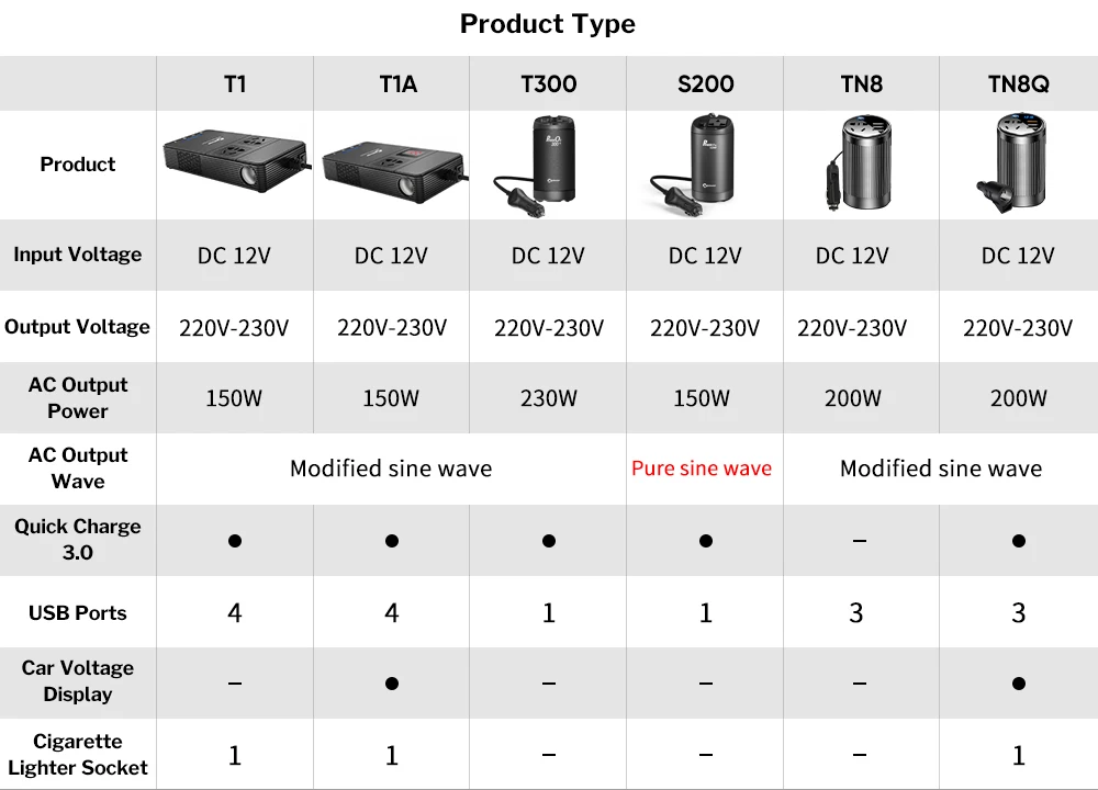•Тип изделия: автомобильный инвертор •Бренд: XP •Модель: T300S / S200S •Материал: металл •Входное напряжение: 12 В постоянного тока •Выходное напряжение переменного тока: 220 В переменного тока( 220 В-230 В ) 50 Гц •Выходное напряжение USB: ПоддержкаБыстрая зарядка DC 3,6 ~ 6,5 V 3A(Поддержка 5 В/3 а) DC 6,5 ~ 9V 2A DC 9 ~ 12V 1.5A •Номинальная мощность: 250 Вт (T300), 150 Вт (S200) •Очистка воздуха: 5 млн анионов •Размеры: Ø6.5 См X 14,1 см •Посылка Размеры:14,5X25X9 см/5,7X9,84X3,54 дюйм (ов) •Вес: 0,52 кг •Вес (в посылка): 0,56 кг/19,75 унций •Универсальный для подавляющего большинства вилок питания