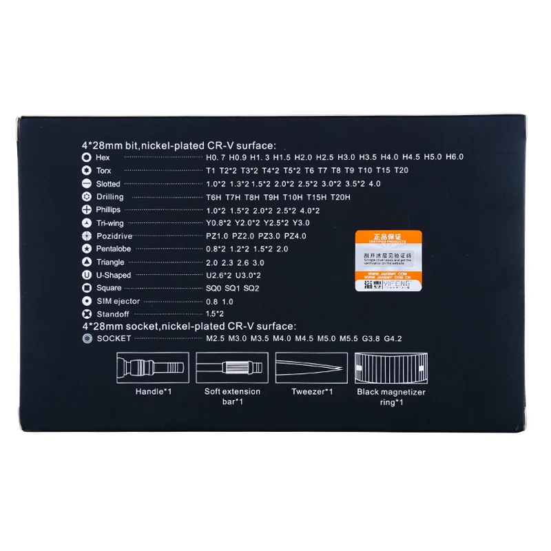 Продукт: Набор прецизионных отверток Особенность: -- Бренд: JAKEMY -- Модель: JM-8176 -- Материал бит: CR-V -Магнитный дизайн, удобный и уникальный -- Полные спецификации, широкий спектр применения, для удовлетворения различных требований к качественному обслуживанию, таких как камеры, часы, магнитофоны, клавиатурные телефоны, ноутбуки мобильный телефон и т. д. Аксессуары -- 4*28 мм бит, никелированная CR-V Поверхность: -- Шестигранный: H0.7 H0.9 H1.3 H1.5 H2.0 H2.5 H3.0 H4.0 H4.5 H5.0 H6.0 -- Torx: T1 T2 * 2 T3 * 2 T4 * 2 T5 * 2 T6 T7 T8 T9 T10 T15 T20 -- Плоская (шлицевая): 1,0*2 1,3*2 1,5*2 2,0*2 2,5*2 3,0*2 3,5*2 4,0 -- Сверление: T6H T7H T8H T9H T10H T15H T20H -- Филлипс: 1,0*2 1,5*2 2,0*2 2,5*2 4,0*2 -- Три крыла: Y0.8 * 2 Y2.0 * 2 Y2.5 * 2 Y3.0 -- Pozidrive: PZ1.0 PZ2.0 PZ3.0 PZ4.0 -- Пятиугольник (Pentalobe): 0,8*2 1,2*2 1,5*2 2,0 -- Треугольник: 2,0 2,3 2,6 3,0 -U-образная форма: U2.6 * 2 U3.0 * 2 -- Квадрат: SQ0 SQ1 SQ2 -- SIM PIN: 0,8 1,0 -- Противостояние: 1,5*2 -- Разъем 4*28 мм, никелированная CR-V Поверхность: -Разъемы: M2.5 M3.0 M3.5 M4.0 M4.5 M5.0 M5.5 G3.8 G4.2 -- Ручка * 1 -- Мягкий удлинитель * 1 -- Пинцет * 1 -- Черный Намагничивающее кольцо * 1 Комплектация: -- 1 Набор прецизионных отверток