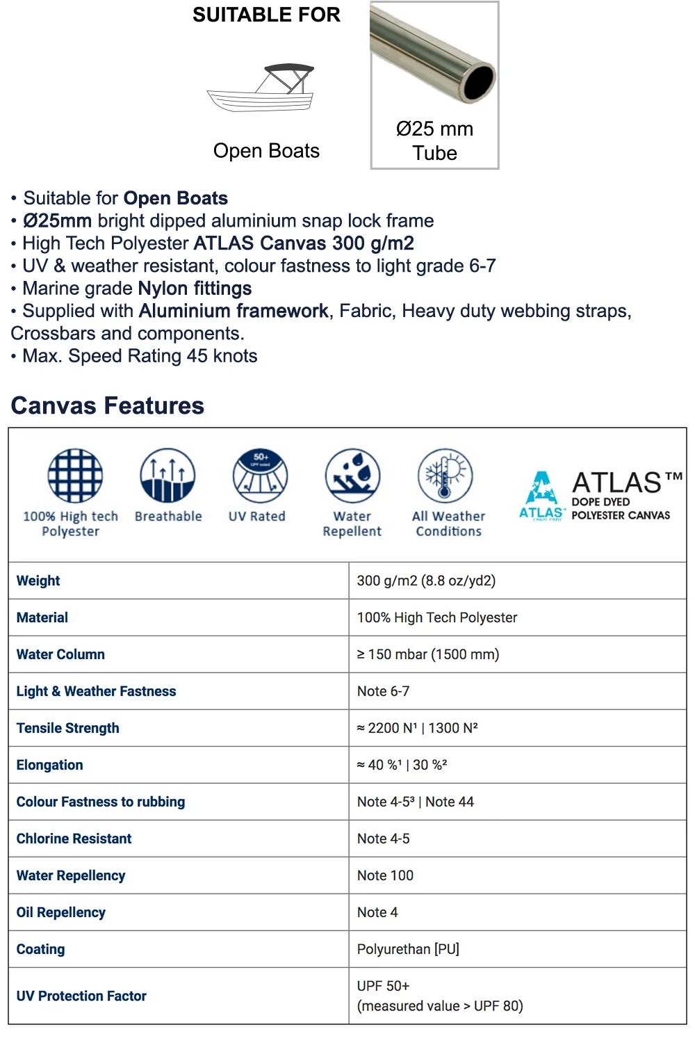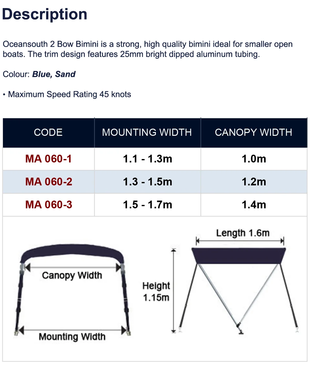 Длина 1,6 м | Высотой до 1,15 м Oceansouth 2 Bow Bimini является сильным, высокое качество bimini идеально подходит для небольших открытых лодок. Дизайн отделки имеет 25 мм яркие погруженные алюминиевые трубки. Цвет: синий, песочный Размер: 1,1 m-1,3 m крепления по ширине 1,3 m-1,5 m ширина крепления 1,5 m-1,7 m крепления по ширине • Подходит для открытых лодок • Ø25 мм яркая оцинкованная алюминиевая оправа с защелкой • Высокотехнологичный полиэстер Атлас холст 300 г/м2 • Устойчивость к ультрафиолетовому излучению и погодным воздействиям, устойчивость к цвету света 6-7 класса • Нейлоновые фитинги морского класса • Поставляется с алюминиевой рамкой, тканью, тяжелыми лямками, перекладинами и компонентами. • Максимальная скорость 45 узлов Холст: • Вес 300g/m2 (8,8 oz/yd2) • Материал: 100% высокотехнологичный полиэстер • Водяной столб ≥ 150 мбар (1500 мм) • Устойчивость к освещению и погодным условиям Примечание 6-7 • Прочность на растяжение ≈ 2200 n¹ | 1300 n² • Удлинение ≈ 40% № | 30% м² • Устойчивость цвета к потере Примечание 4-5 ³ | Примечание 44 • Устойчивость к хлору Примечание 4-5 • Водонепроницаемость Примечание 100 • Масляная защита Примечание 4 • Покрытие из полиуретана • УФ-фактор защиты UPF 50 + (Измеренное значение> UPF 80) При покупке Bimini: Во-первых, решите, где вы хотели бы установить bimini. Там, где вы решите установить верх, а также его высоту и длину, будет определяться расположение теней, которые он предоставляет. Как только вы определите точки крепления, Измерьте расстояние между ними прямой линии, не сгибая ленту, чтобы избежать препятствий. Это измерение соответствует вашей ширине крепления и должно отличаться от общей/ширины луча вашей лодки. Наконец, выберите диапазон ширины, который наиболее близок к вашим измерениям.