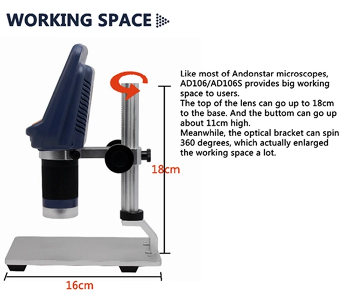 Как и большинство микроскопов Andonstar, AD106/AD106S обеспечивает большую рабочую площадь для пользователей.