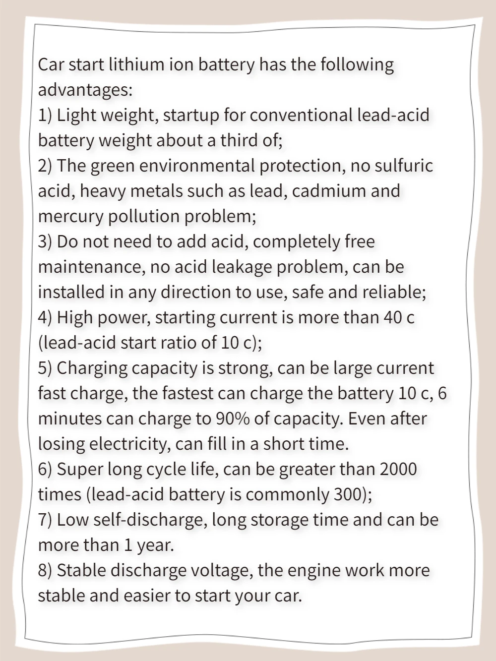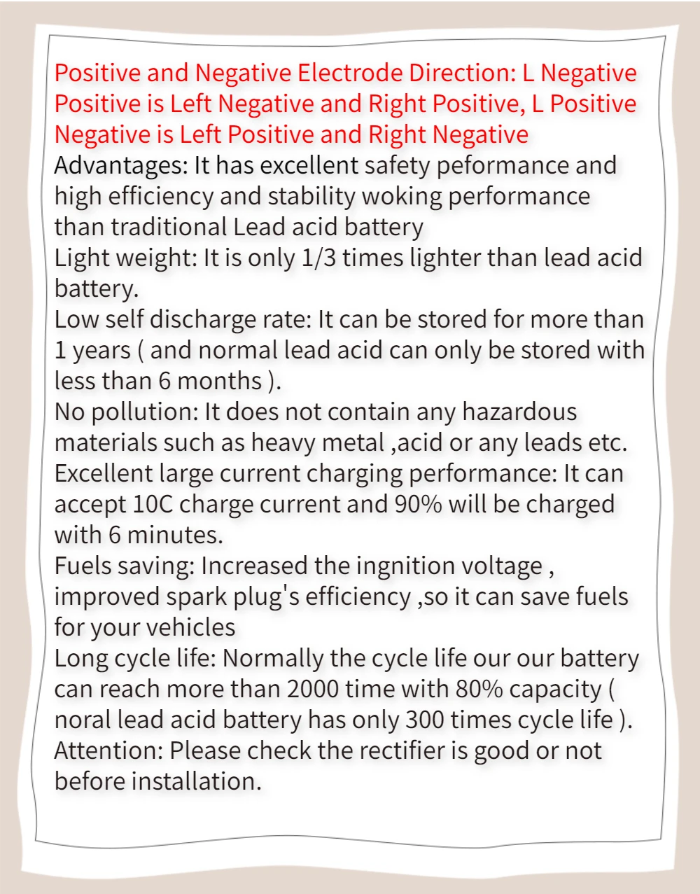 Преимущества: он имеет отличную безопасность и высокую эффективность и стабильность производительности, чем традиционные свинцово-кислотные батареи Вес светильника: светильник в 1/3 раза больше, чем свинцово-кислотный аккумулятор. Низкий уровень саморазряда: он может храниться более 1 года (и нормальная свинцовая кислота может храниться только менее 6 месяцев). Отсутствие загрязнения: он не содержит каких-либо опасных материалов, таких как тяжелые металлы, кислоты или любые провода и т. Д. Отличная большая производительность зарядки: он может принимать ток зарядки 10C и 90% будет заряжаться за 6 минут. Экономия топлива: увеличение входного напряжения, повышение эффективности свечей зажигания, что позволяет экономить топливо для ваших автомобилей Длительный срок службы: как правило, срок службы нашей батареи может достигать более 2000 раз с емкостью 80% (свинцово-кислотная батарея noral имеет срок службы всего в 300 раз). Внимание: перед установкой проверьте правильность выпрямителя. Литиево-ионный аккумулятор для мотоцикла имеет следующие преимущества: 1) Вес светильника, запуск для обычных свинцово-кислотных аккумуляторов примерно на одну третью часть; 2) Экологическая защита, отсутствие серной кислоты, тяжелых металлов, таких как свинец, кадмий и ртутное загрязнение; 3) не нужно добавлять кислоту, полностью бесплатное обслуживание, отсутствие проблемы с утечкой кислоты, может быть установлен в любом направлении для использования, безопасный и надежный; 4) Высокая мощность, пусковой ток составляет более 40 с (отношение начала свинцово-кислотного пуска 10 с); 5) ЗАРЯДНАЯ способность сильна, может быть большой ток быстрой зарядки, самый быстрый может зарядить аккумулятор 10 с, 6 минут можно зарядить до 90% емкости. Даже после потери электричества, можно заполнить в течение короткого времени. 6) сверхдлительный срок службы, может быть больше 2000 раз (свинцово-кислотная батарея обычно 300); 7) Низкий саморазряд, длительное время хранения и может быть более 1 года. 8) стабильное напряжение разряда, двигатель работает более стабильно и проще, чтобы начать ваш мотоцикл.