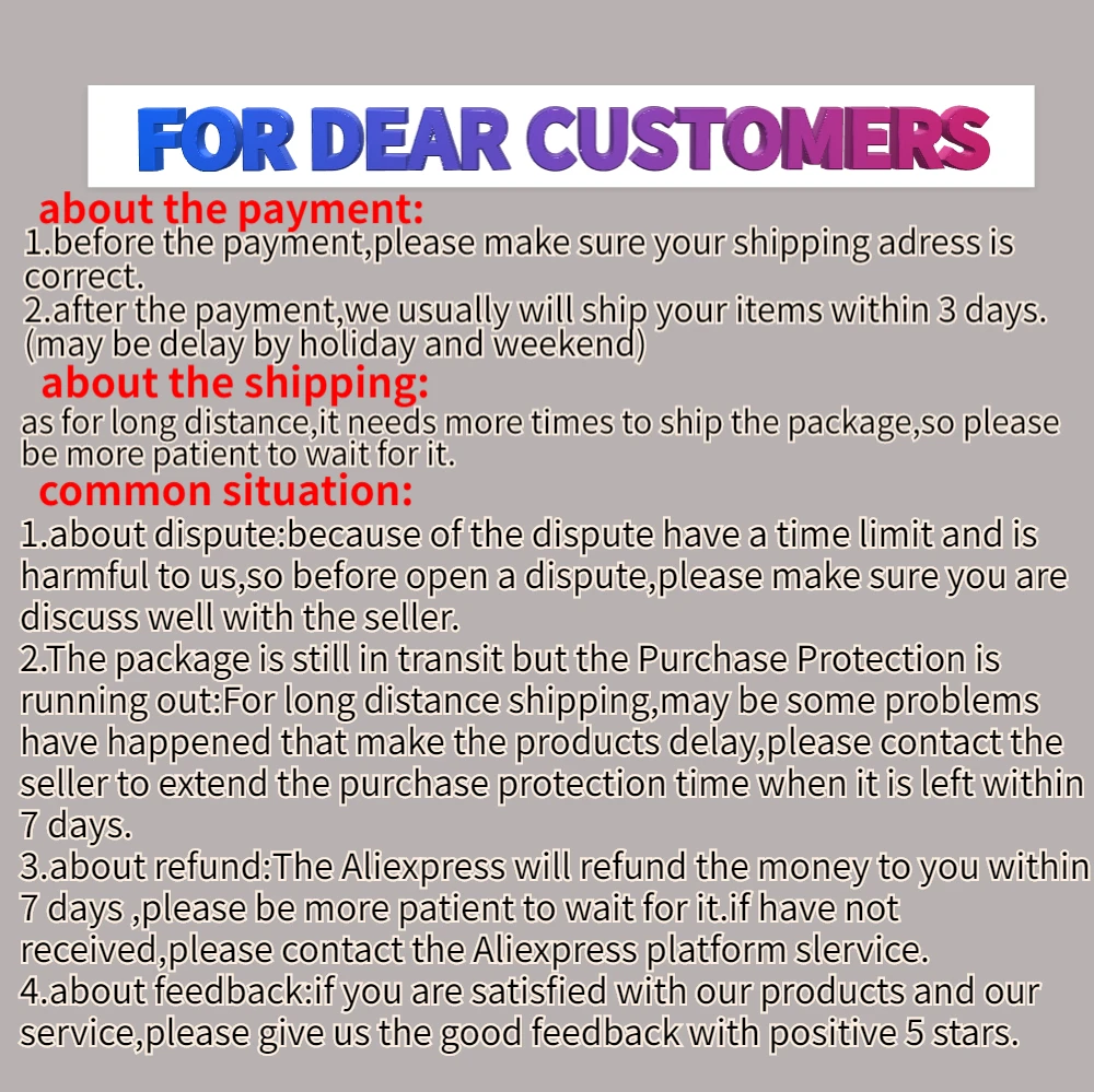 Если вы удовлетворены нашей работой и продуктами, пожалуйста, оставьте нам пять звезд, отзывы и расскажите своим друзьям; Если нет, пожалуйста, свяжитесь с нами, прежде чем оставлять негативные отзывы. Мы можем работать вместе, чтобы разрешить любой спор. Ваше удовлетворение является нашим главным приоритетом. Добро пожаловать в наш магазин!
