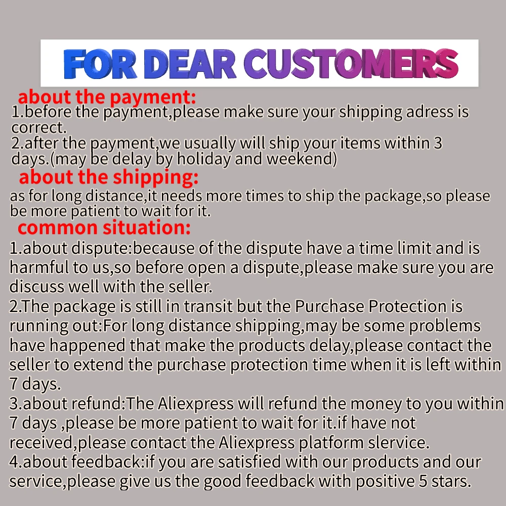 Если вы удовлетворены нашей работой и продуктами, пожалуйста, оставьте нам пять звезд, отзывы и расскажите своим друзьям; Если нет, пожалуйста, свяжитесь с нами, прежде чем оставлять негативные отзывы. Мы можем работать вместе, чтобы разрешить любой спор. Ваше удовлетворение является нашим главным приоритетом. Добро пожаловать в наш магазин!