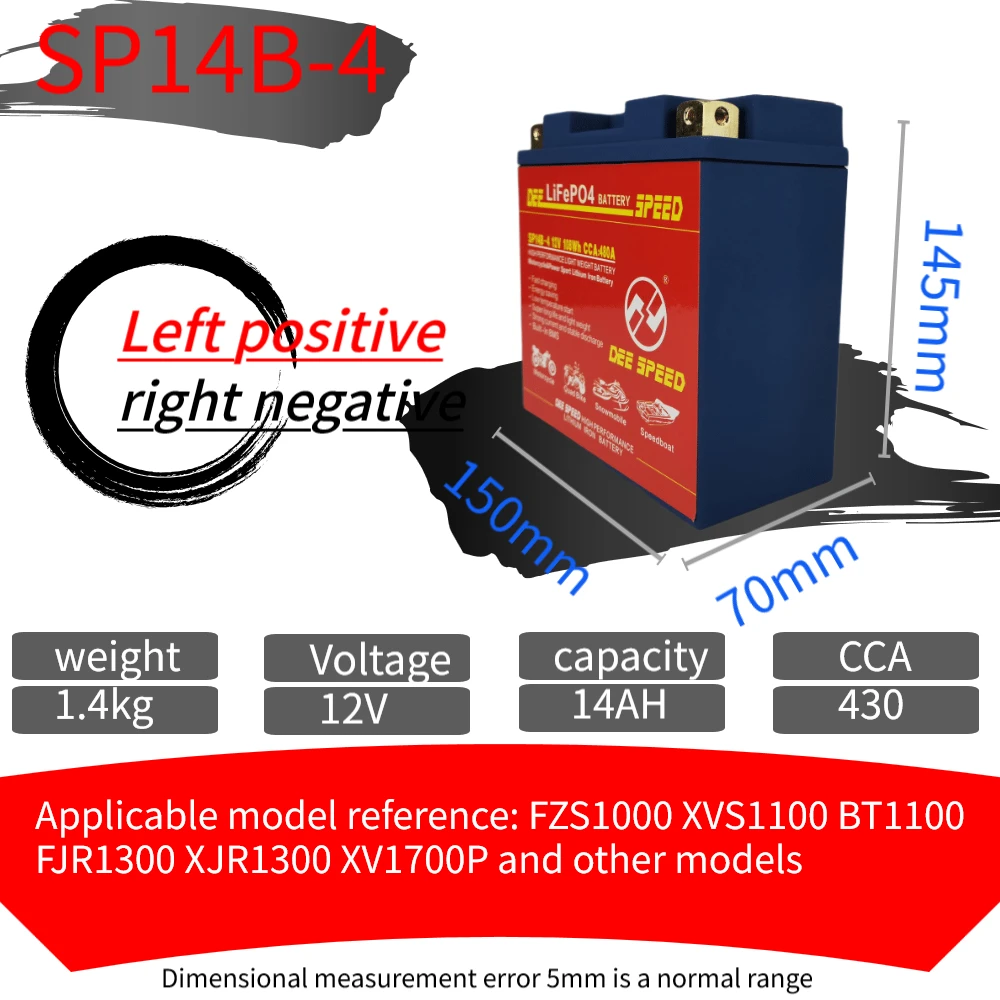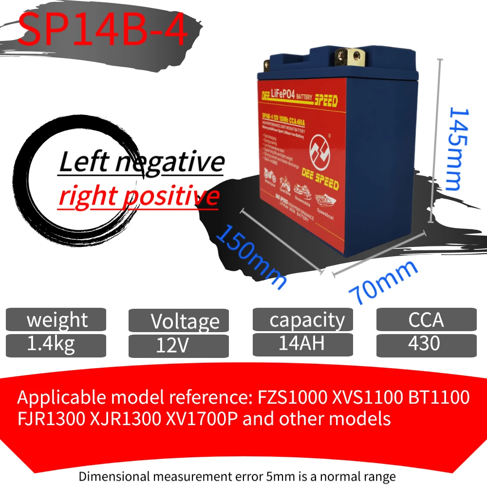 Партномер: SP14B-4 Ёмкость: 14Ah CCA: 430A Максимальное напряжение защиты: 14,6 в Конечное напряжение: 8 в Размер: 150*70*145 мм Вес: 1,4 кг Сертификат: CE ROHS MSDS UN38.3 Высококачественные детали/аксессуары: класс А Плата защиты напряжения: Да Срок службы: более 2000 раз Максимальный ток зарядки: 10 A Подходит для: Little Monkey JOG Magnolia AG50 Little Sand 90 Big Louis 90 и т. Д. Направление положительного и отрицательного электрода: L отрицательное положительное оставлено отрицательное и правое положительное, L положительное отрицательное оставлено положительное и правое отрицательное Посылка включает в себя: 1. Одна батарея стартера скорости ди 2. Одно специализированное зарядное устройство