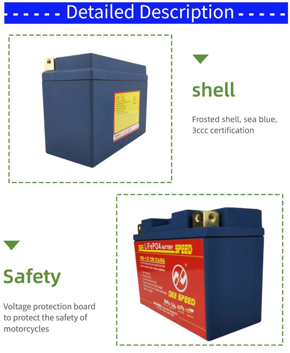 Lifepo4 батарея мгновенный ток разряда (1Ah) :30A Свинцово-кислотный аккумулятор мгновенный ток разряда (1Ah) :10A Срок службы батареи lifepo4 более 2000 раз Срок службы свинцово-кислотной батареи около 300 раз Lifepo4 эффективность зарядки аккумулятора: 3 ℃ Свинцово-кислотный аккумулятор эффективность зарядки: 1 ℃ Срок автономной разрядки аккумулятора lifepo4: 0.1% Свинцово-кислотная батарея год саморазряда: 10% Lifepo4 энергоэффективность батареи: 95% Свинцово-кислотная батарея Энергоэффективность: 60% Lifepo4 аккумулятор начинает переходное напряжение колебания: 0,2 ~ 0,5 В Свинцово-кислотная батарея начинает переходное напряжение колебания: 1,0 ~ 2,0 в Lifepo4 разрядка батареи tenperature : -25 ℃ ~ 80 ℃ Свинцово-кислотная разрядка батареи: -10 ℃ ~ 30 ℃ Lifepo4 плата защиты батареи: bms встроенный Защитная панель свинцово-кислотного аккумулятора: нет Преимущества: он имеет отличную безопасность и высокую эффективность и стабильность производительности, чем традиционные свинцово-кислотные батареи Светильник вес: это только в том случае, 1/3 раз светильник er, чем свинцово-кислотных аккумуляторных батарей. Низкий уровень саморазряда: он может храниться более 1 года (и нормальная свинцовая кислота может храниться только менее 6 месяцев). Отсутствие загрязнения: он не содержит каких-либо опасных материалов, таких как тяжелые металлы, кислоты или любые провода и т. Д. Отличная большая производительность зарядки: он может принимать ток зарядки 10C и 90% будет заряжаться за 6 минут. Экономия топлива: увеличение входного напряжения, повышение эффективности свечей зажигания, что позволяет экономить топливо для ваших автомобилей Длительный срок службы: как правило, срок службы нашей батареи может достигать более 2000 раз с емкостью 80% (свинцово-кислотная батарея noral имеет срок службы всего в 300 раз). Внимание: перед установкой проверьте правильность выпрямителя. Литиево-ионный аккумулятор для мотоцикла имеет следующие преимущества: 1) светильник вес, запуска для традиционных свинцово-кислотная батарея Вес около одной трети; 2) Экологическая защита, отсутствие серной кислоты, тяжелых металлов, таких как свинец, кадмий и ртутное загрязнение; 3) не нужно добавлять кислоту, полностью бесплатное обслуживание, отсутствие проблемы с утечкой кислоты, может быть установлен в любом направлении для использования, безопасный и надежный; 4) Высокая мощность, пусковой ток составляет более 40 с (отношение начала свинцово-кислотного пуска 10 с); 5) ЗАРЯДНАЯ способность сильна, может быть большой ток быстрой зарядки, самый быстрый может зарядить аккумулятор 10 с, 6 минут можно зарядить до 90% емкости. Даже после потери электричества, можно заполнить в течение короткого времени. 6) сверхдлительный срок службы, может быть больше 2000 раз (свинцово-кислотная батарея обычно 300); 7) Низкий саморазряд, длительное время хранения и может быть более 1 года. 8) стабильное напряжение разряда, двигатель работает более стабильно и проще, чтобы начать ваш мотоцикл.