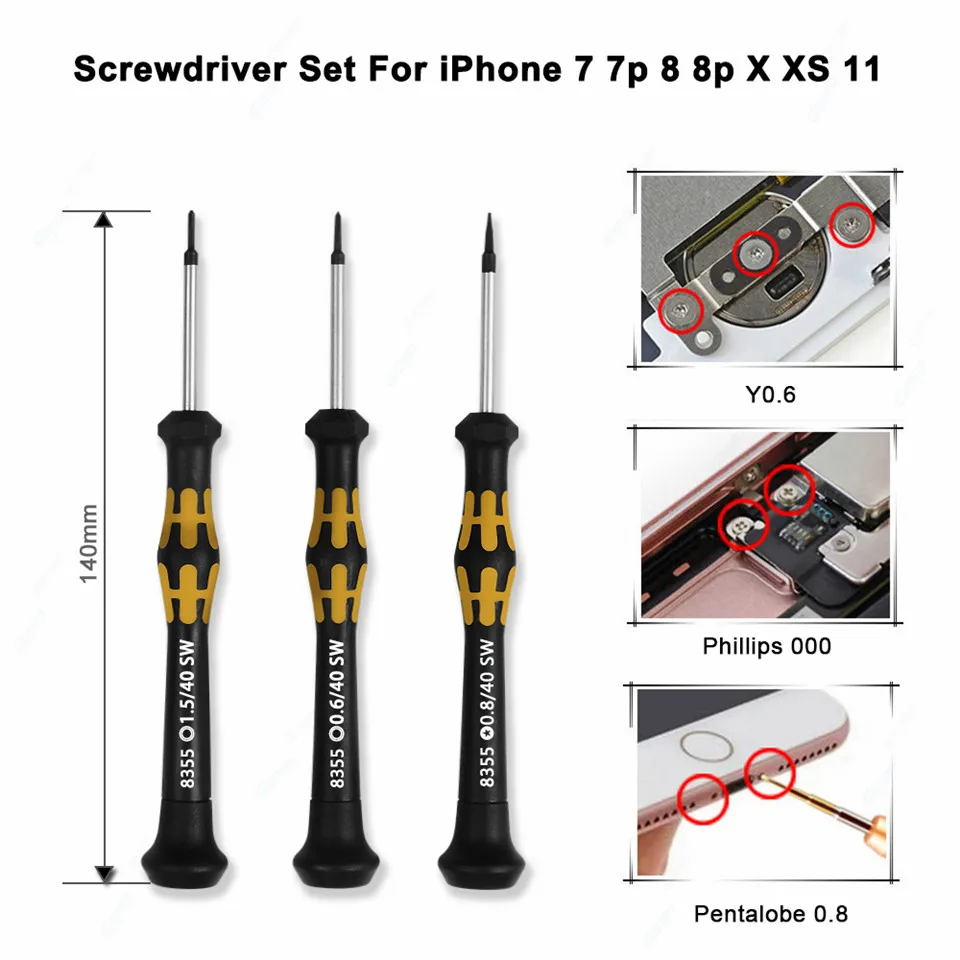 Многофункциональный набор инструментов для ремонта отверток: ● Идеальный набор инструментов для открытия iPhone 11 X XS 8P 8 7. ● Содержит все инструменты для захвата, захвата, подъема, безопасности ESD и вождения винтов, необходимые для обслуживания бытовой электроники. ● Все инструменты, необходимые для начала ремонтных работ. Вы можете использовать их для замены аккумулятора, замены экрана. ● Практичная отвертка может решить большинство проблем. Простые в использовании инструменты должны использоваться без чтения руководства. Этот портативный набор инструментов для ремонта является удобным инструментом. Полный набор инструментов может удовлетворить большинство проблем, связанных с разборкой и ремонтом. Содержимое комплекта> ● 1x металлический нож для скальпеля-защелкивающаяся конструкция лезвия обеспечивает острый край каждый раз. Он может использоваться для очистки стеклянных наклеек, резки бумаги, пластиковой пленки, текстиля, резьбы по дереву, ручной работы, использования пленки на мобильный телефон, домашнего творчества и т. д. Потому что лезвие очень остро, используется сразу после крышки, не позволяйте детям прикоснуться. ● 1 металлический нож для вскрытия лезвия-предназначен для очистки или фиксации во время открытия или фиксации телефона или планшета. ● 2x Пинцет ESD-Точный Пинцет для обработки небольших проводов, винтов и достижения того места, где пальцы не могут. ● 1х нейлоновый антистатический спуджер-заостренный конец Spudger может использоваться для подключения/отключения компонентов, удержания предметов для пайки или тыкания чего-то, что требует тыкания. • 1x крышки Pentalobe 0,8 мм отвертка для снятия хвостовой винт для iPhone. ● 1 отвертка Y 0,6-для удаления винтов в форме Y внутри iphone 7 7p 8 8p X XS. • 1x Phillips 1,5 мм-для снимите винты Phillips Внутри iphone. ● 1x16 в 1 Набор отверток ● 1x сумка для хранения из ткани Оксфорд-удобное хранение. Набор отверток 16 в 1 включает> ● 1 отвертка ● 1 отвертка для гаек ● Винтовые биты следующих размеров: ○Драйвер гайки-M2.5, M3.0, M3.5, M4.0, M4.5, M5.0 M5.5 ③ T2-T4, ③ T5-T6, ③ T8-T10, ③ PH #000-1,5 мм, ○PH #00-1,8 мм, ③★0,8-★1,2, · Y2.0-Y3.0 Посылка в комплекте> 28 в 1 набор многофункциональных отверток Инструменты для ремонта сотового телефона