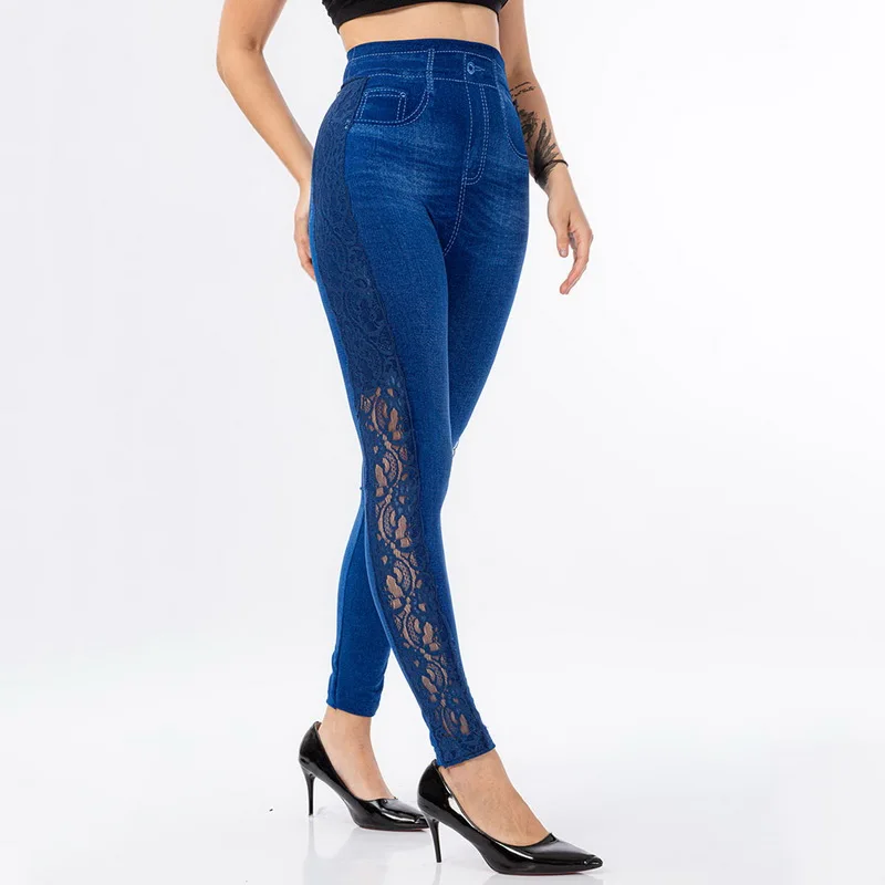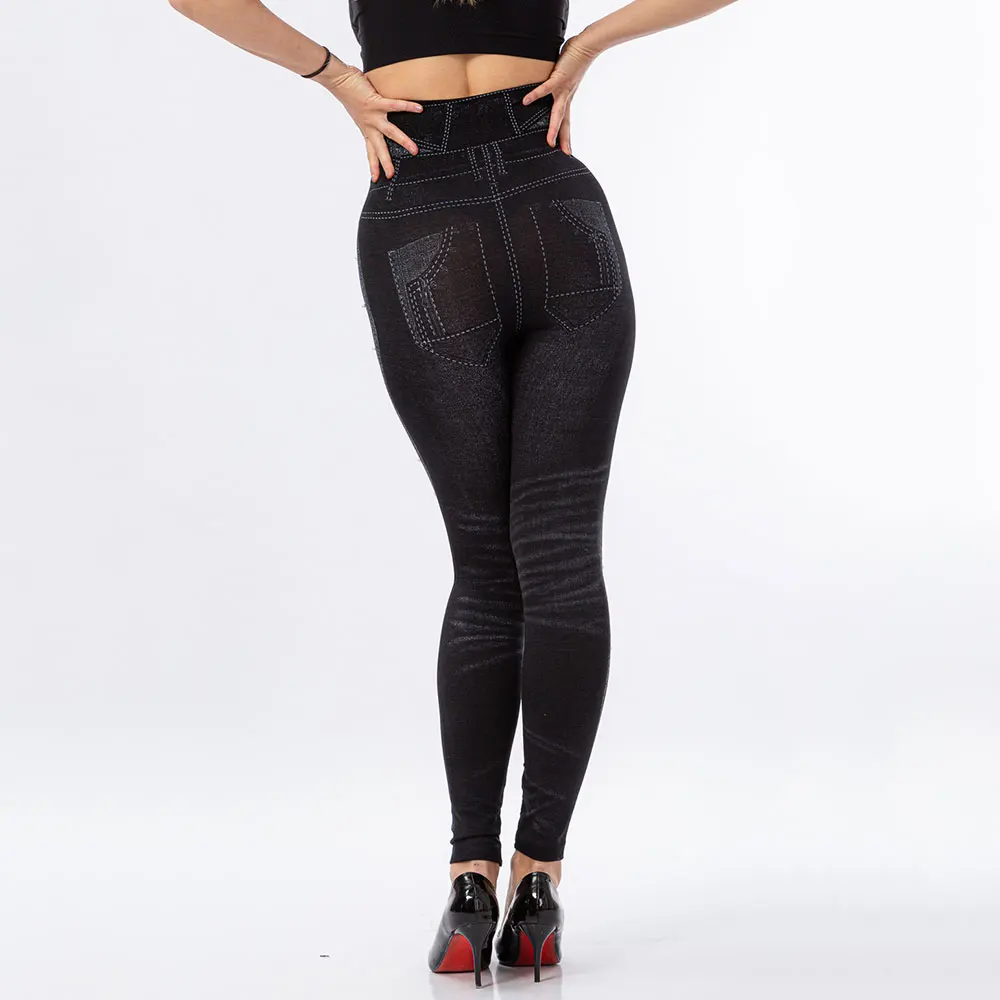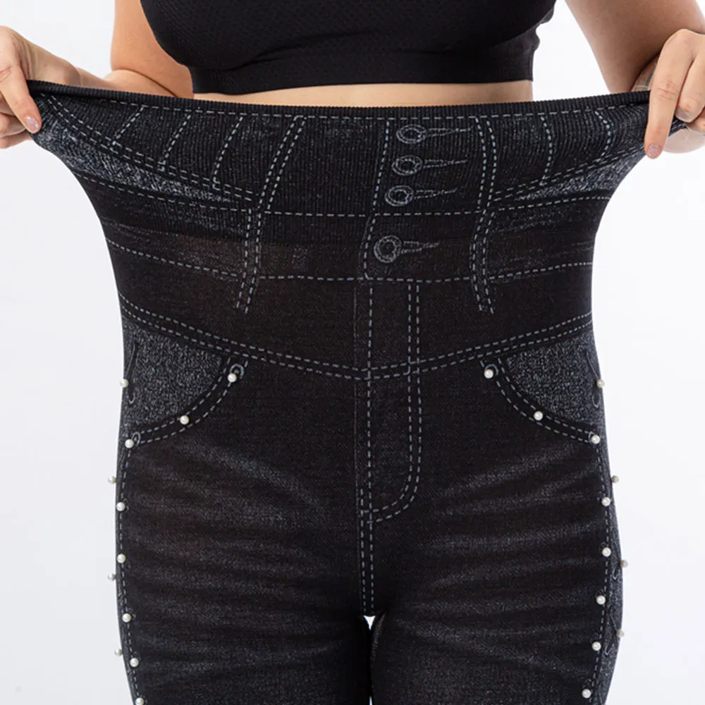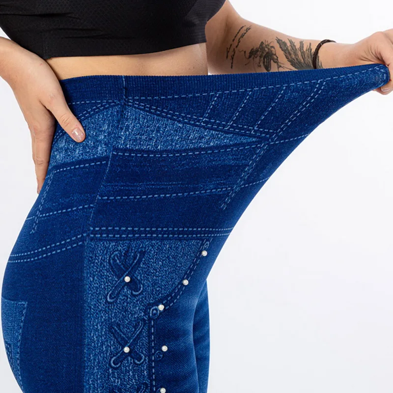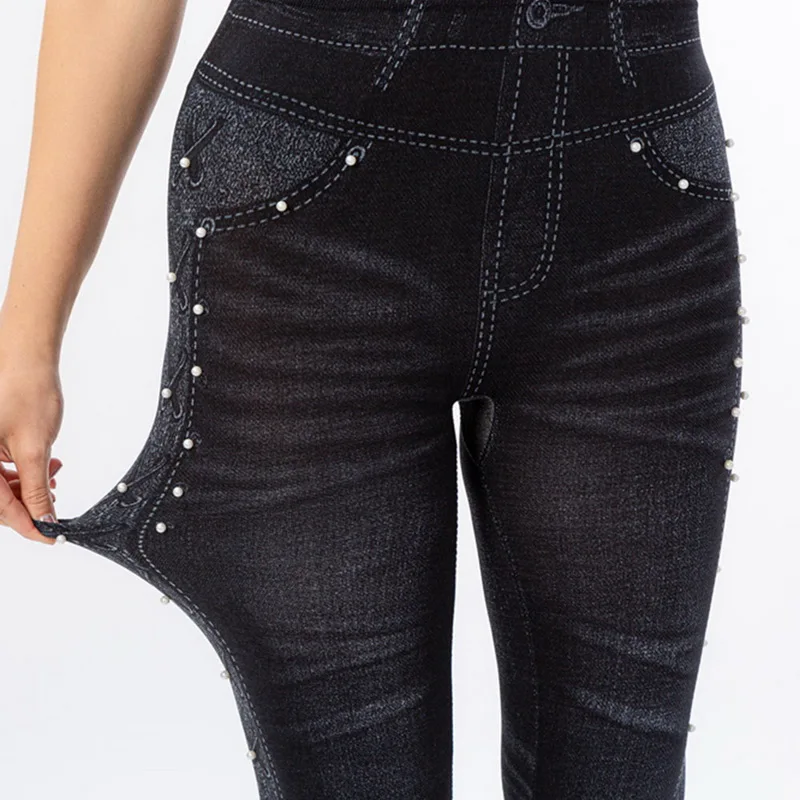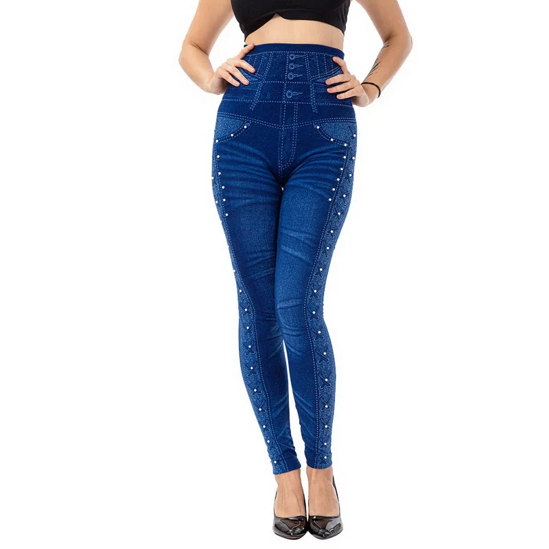 Характеристики: Эти леггинсы с имитацией джинсовой ткани с бусинами. Трехмерный крой, чтобы показать изгиб Ваших бедер. Ткань плотно прилегает и сильно растягивается.