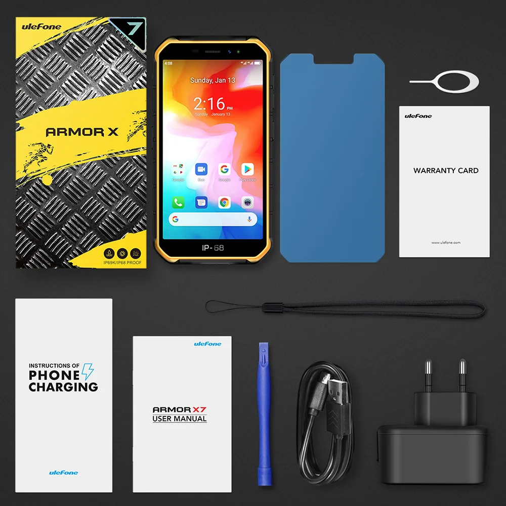 1 x Armor X7 Phone (батарея входит в комплект) 1 зарядное устройство переменного тока (100 ~ 240 В/штепсельная вилка европейского стандарта) 1 x Кабель для передачи данных (100 см) Защитная пленка-1 шт. 1 х слинг 1 х пластиковая лопатка 1 x SIM игла 1 гарантийный талон 1 х многоязычное Руководство пользователя