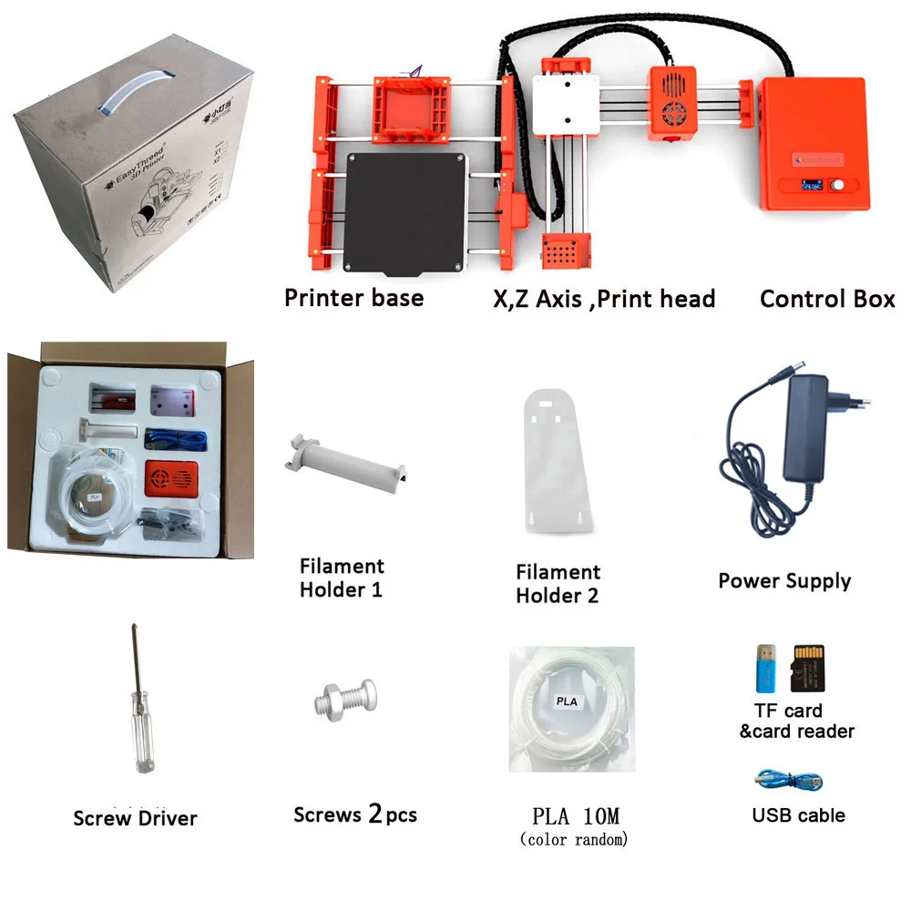 Easythreed X2 мини 3D принтер для начинающих бытовой игрушки образования студентов ЖК-экран управления маленький 3D принтер Описание: 3D принтер Easythreed X2 является потребительским 3D принтером. Он поставляется с собственным программным обеспечением для нарезки (Easyware), которое было специально изготовлено и имеет уникальную функцию автоматического нарезки, основанную на ваших предпочтениях времени и качества. Особенности: -Очень светильник, носить и ходить. Очень тихий. Сертификат: CE,FCC,RoHs -Супер Простота установки, простота в эксплуатации и удобство. -Подходит для домашнего парового образования или DIY любителей. -Для детей и семей, поэтому я печатаю только нить PLA safefy .. Храктеристика устройства: Название модели: X2 Бренд: Easythreed Принт Технология: FDM Автоматическое выравнивание кровати: нет Здание Размеры: 100X100X100mm Количество сопла: 1 Сопло Диаметр: 0,4 мм Толщина слоя: 0,05-0,3 мм Волоконного принтера: PLA Диаметр нити: 1,75 мм Точность печати: 0,1-0,2 мм Очаг: нет Программное обеспечение для резки: Easyware, CURA,Simplify3D Температура экструдера: 180-230 ℃ Скорость печати: 10-40 мм/сек. Формат Fila: Вход:.Stl/obj, выход:.gcode Мощность: 12 В, 30 Вт Размер машины: 205*210*245 мм Размер подарочной коробки: 140*260*260 мм Машина Вес брутто: 2,0 кг Вес нетто: 1,3 кг Платформа обслуживания: съемные Поддержка ОС: Windows XP/7/8/10 (32 бит/64 бит) Подключение к печати: tf-карта, usb-кабель, Wifi Промышленные Сертификаты: CE, FCC, RoHS