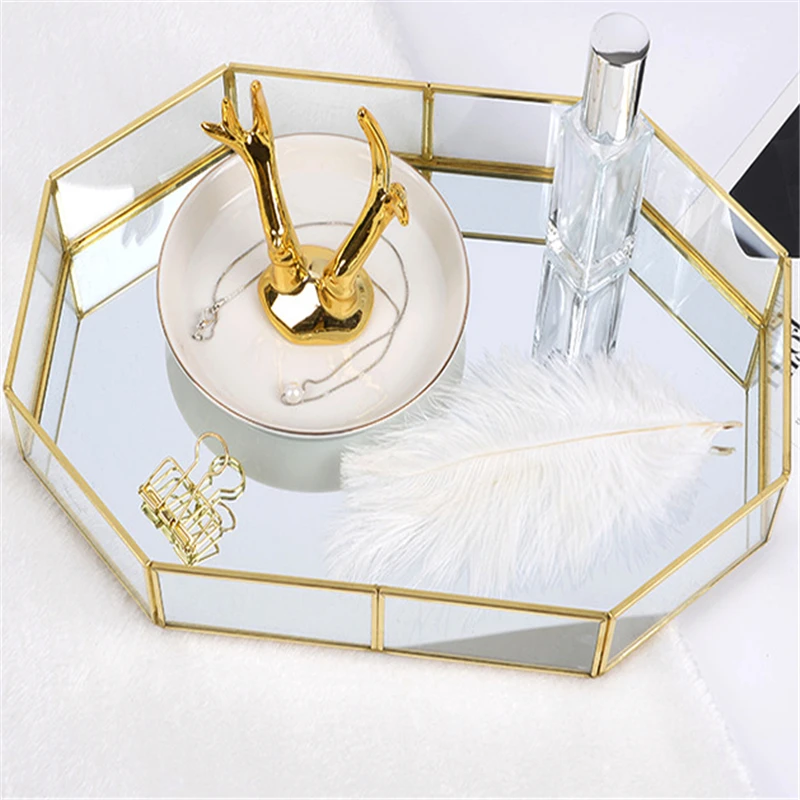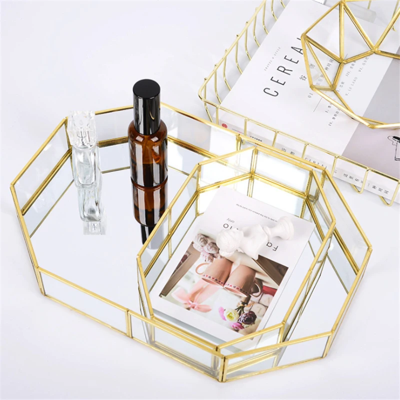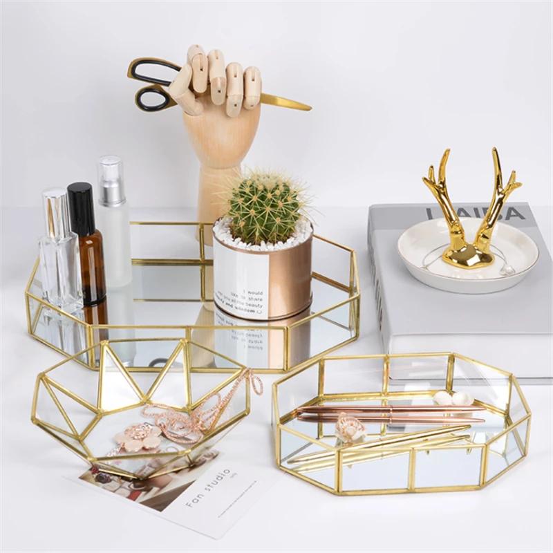 Скандинавский Ins органайзер для косметики для нанесения макияжа лоток для хранения ювелирных изделий Золотой полигон стекло геометрический торт десертная тарелка кухонное украшение для дома JE