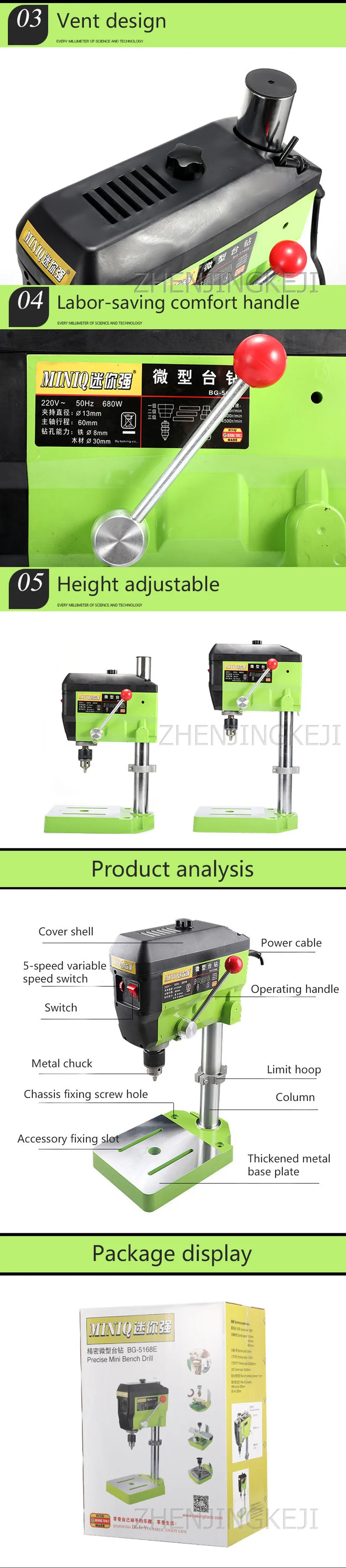 Название продукта: настольная дрель Модель: 5168E Мощность: 680 Вт Скорость: 1100-4500р/мин Ход: 60 мм Захват: 1,5-13 мм Рабочий радиус: 143 мм Вес нетто: 10 кг Размеры: 550 (мм) Диапазон диаметра бурения: 220 (мм) Диапазон скорости шпинделя: 1100-1500 (об/мин) Форма управления: руководство Применимая промышленность: Деревообработка Форма компоновки: вертикальная Сфера применения: общие Материал объекта: дерево