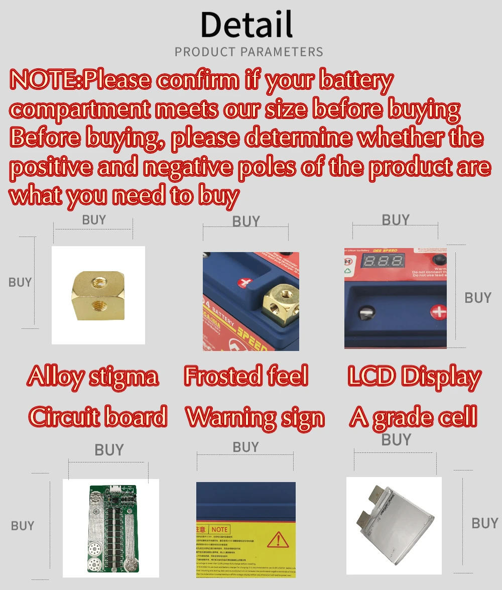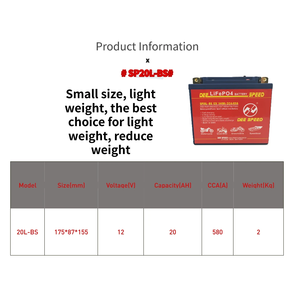 Партномер: SP20L-BS Ёмкость: 20Ah CCA: 580 Максимальное напряжение защиты: 14,6 в Конечное напряжение: 8 в Размер: SP20L-BS 175*87*155 мм Вес: 2 кг Сертификат: CE ROHS MSDS UN38.3 Высококачественные детали/аксессуары: класс А Плата защиты напряжения: Да Срок службы: более 2000 раз Максимальный ток зарядки: 10A Подходит для: Little Monkey JOG Magnolia AG50 Little Sand 90 Big Louis 90 и т. Д. Направление положительного и отрицательного электрода: L отрицательное положительное оставлено отрицательное и правое положительное, L положительное отрицательное оставлено положительное и правое отрицательное Посылка включает в себя: 1. Одна батарея стартера скорости ди 2. Одно специализированное зарядное устройство