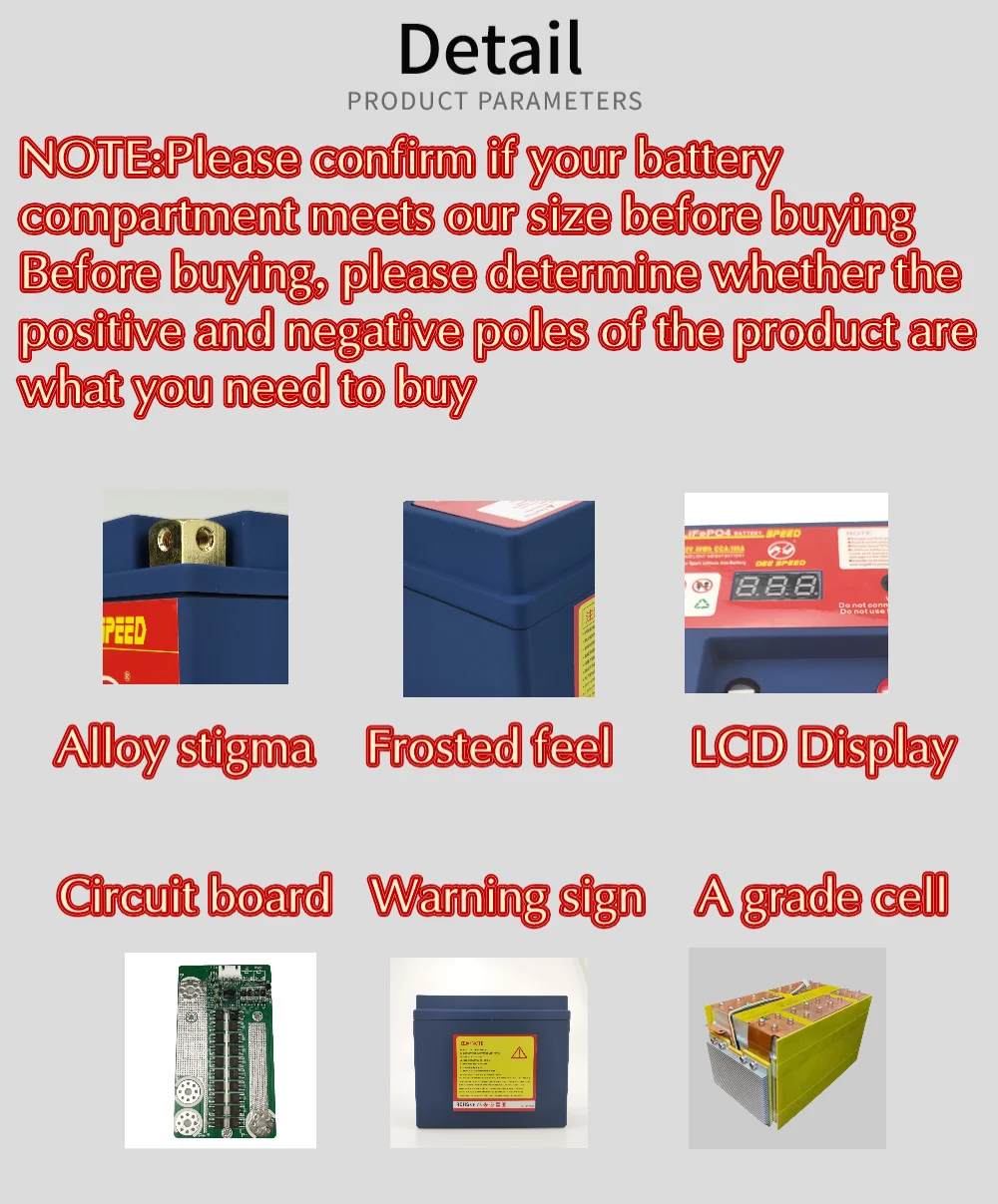 1. Пожалуйста, сообщите нам, какой бренд и модель вашего мотоцикла, мы порекомендуем подходящие модели для вас. 2. Перед установкой и использованием убедитесь, что вся электрическая система мотоцикла является нормальной (Е. g. Выпрямитель, Магнето и есть ли утечка электричества) и избегайте доставки в оба конца, вызванной возвратом товаров, кроме батареи, перед проблемами качества. 3. Пожалуйста, проверьте положительное и отрицательное направление оригинальной батареи перед покупкой, чтобы избежать ситуации, которая не может быть установлена после покупки. 4. Стандарты измерения свинцово-кислотных батарей и батарей lifepo4 отличаются, можно рассматривать как количество liftpo4, разделенное на два, что эквивалентно емкости свинцово-кислотных батарей. (Например, 4.5AH для батареи lifepo4 эквивалентен 9AH для свинцово-кислотной батареи, но пусковой ток такой же, как для свинцово-кислотных 9AH). 5. Если мотоцикл оснащен другими электрическими приборами, потребление электроэнергии будет зависеть, особенно GPS и сигнализация, что значительно повлияет на состояние ожидания литиевой батареи.