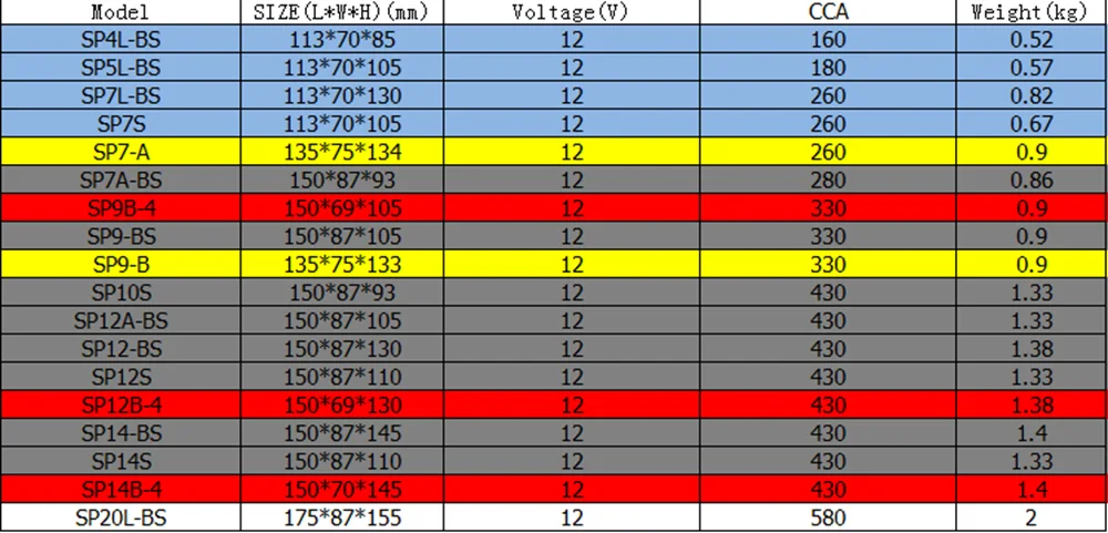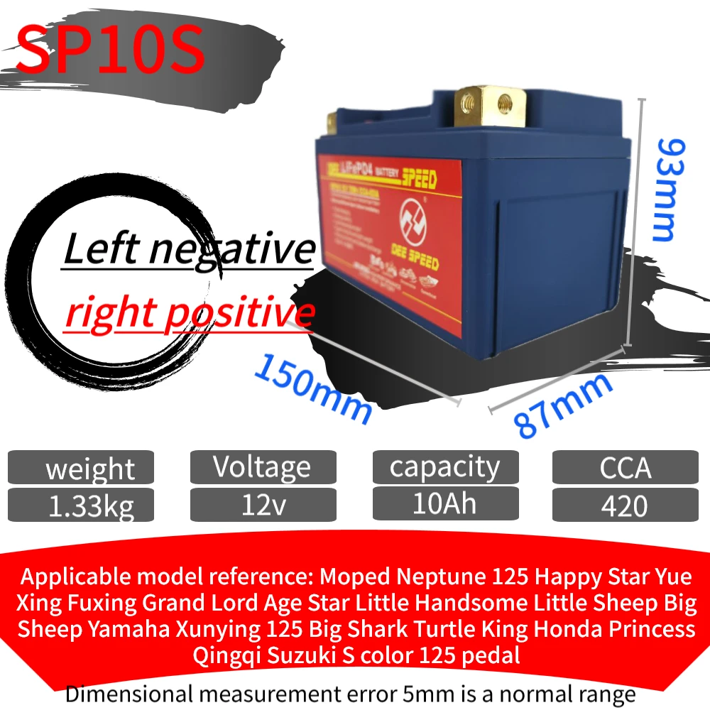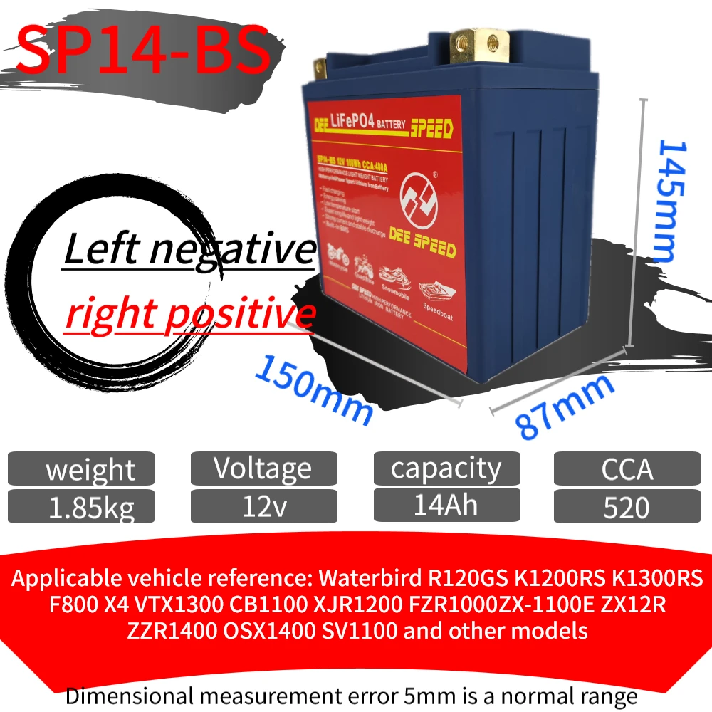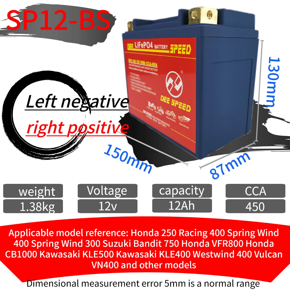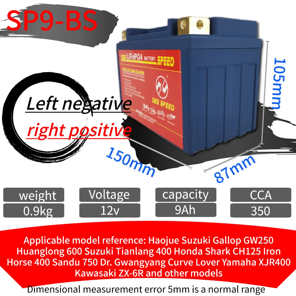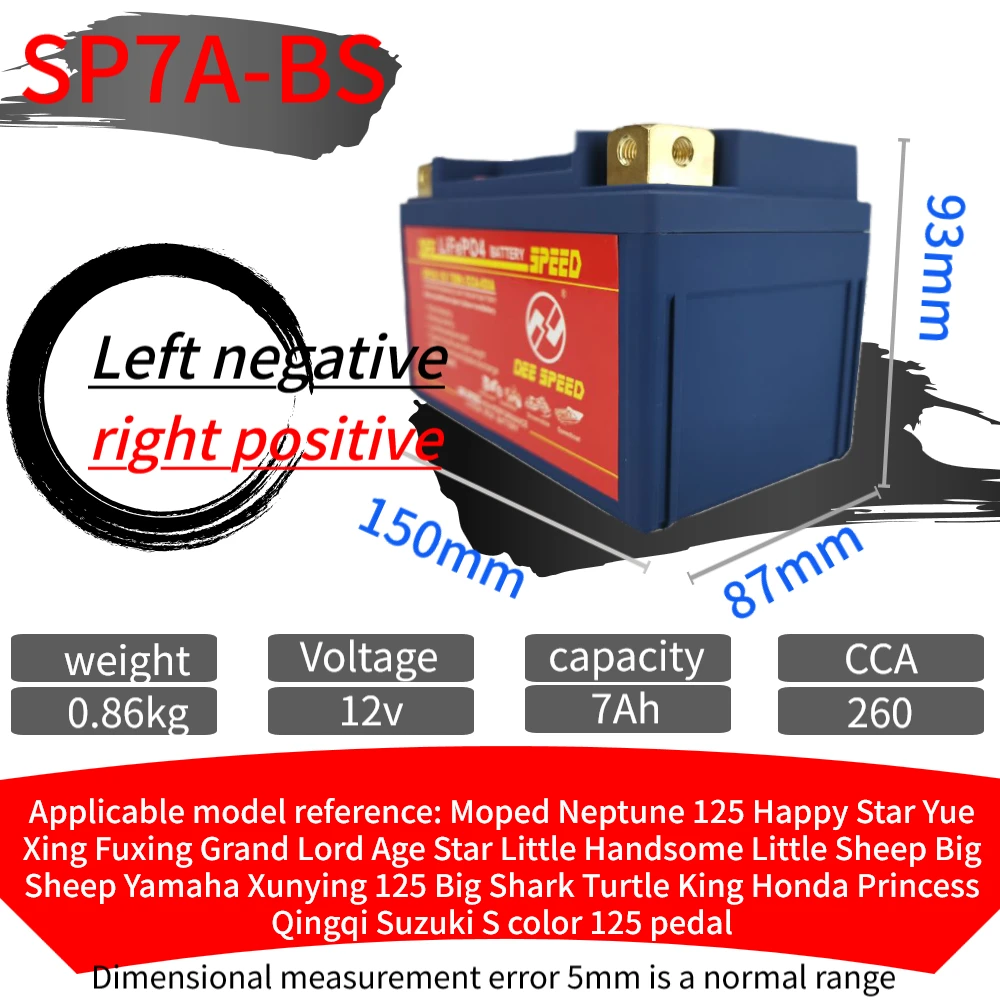Партномер: SP7A-BS SP9-BS SP10S SP12A-BS SP12-BS SP12S SP14-BS SP14S Ёмкость: 7Ah 9Ah 10Ah 12Ah 14Ah CCA: 280A 330A 430A Максимальное напряжение защиты: 14,6 в Конечное напряжение: 8 в Размеры: SP7A-BS 150*87*93 мм SP9-BS 150*87*105 мм SP10S 150*87*93 мм SP12A-BS 150*87*105 мм SP12-BS 150*87*130 мм SP12S 150*87*110 мм SP14-BS 150*87*145 мм SP14S 150*87*110 мм Ручное измерение с погрешностью от 3 мм до 5 мм Сертификат: CE ROHS MSDS UN38.3 Высококачественные детали/аксессуары: класс А Плата защиты напряжения: Да Срок службы: более 2000 раз Максимальный ток зарядки: 10A Подходит для: Little Monkey JOG Magnolia AG50 Little Sand 90 Big Louis 90 и т. Д. Направление положительного и отрицательного электрода: L отрицательное положительное оставлено отрицательное и правое положительное, L положительное отрицательное оставлено положительное и правое отрицательное Посылка включает в себя: 1. Одна батарея стартера скорости ди 2. Одно специализированное зарядное устройство