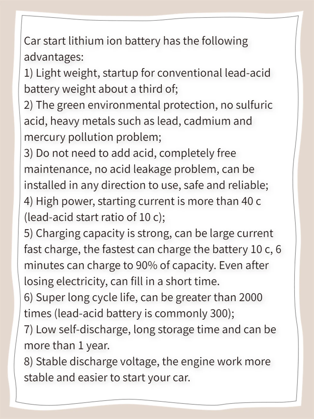 Преимущества товара: Легко носить с собой, светильник вес, высокая емкость, высокая быстросъемной площадки, длительное время работы, длительный срок службы, Безопасность и защита окружающей среды Он имеет отличную безопасность и высокую эффективность и стабильность производительности, чем традиционные свинцово-кислотные батареи Светильник вес: это только в том случае, 1/3 раз светильник er, чем свинцово-кислотных аккумуляторных батарей. Низкий уровень саморазряда: он может храниться более 1 года (и нормальная свинцовая кислота может храниться только менее 6 месяцев). Отсутствие загрязнения: он не содержит каких-либо опасных материалов, таких как тяжелые металлы, кислоты или любые провода и т. Д. Отличная большая производительность зарядки: он может принимать ток зарядки 10C и 90% будет заряжаться за 6 минут. Экономия топлива: Увеличение напряжения зажигания, повышение эффективности свечи зажигания, так что это может сэкономить топливо для ваших автомобилей. Длительный срок службы: как правило, срок службы нашей батареи может достигать более 2000 раз с емкостью 80% (свинцово-кислотная батарея noral имеет срок службы всего в 300 раз). Внимание: Пожалуйста, проверьте выпрямитель хороший или не перед установкой. Применение: Электрическая машина, ксеноновая лампа/прожектор, инвертор, портативные устройства, оборудование для беспроводной связи, контрольное оборудование, силовое оборудование, медицинские инструменты, рельефное оборудование, аварийное освещение/светодиодные лампы, дорожные знаки, портативная маленькая бытовая техника, электрические инструменты, автомобильное и промышленное оборудование резервного питания Безопасность меры предосторожности 1. Не бросайте батарею в воду или не мочите 2. Держите батарею подальше от источника тепла 3. Не бросайте батарею в огонь или не нагревайте батарею 4. Не позволяйте молотить, чтобы затоптать батарею 5. Не допускайте разборки батареи в любом случае