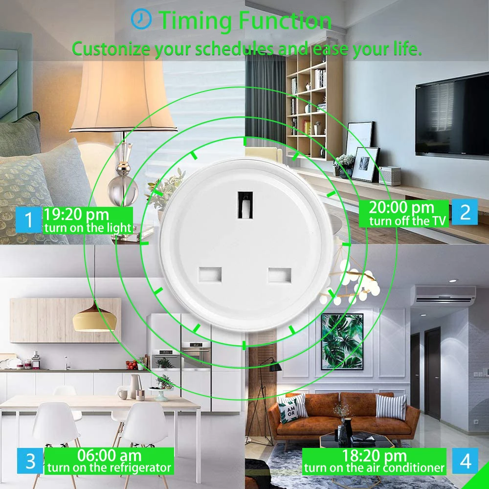 Особенности: 1. Дистанционный переключатель/смарт-синхронизация Управляйте своим бытовую технику в любое время и в любом месте, и вы можете включить/выключить тех устройств через смартфоны под управлением IOS или Android системы. 2. Настройка времени: Вы можете планировать и устанавливать определенное время для автоматического включения/выключения вашего домашнего устройства в гостиной, кухни, спальня, или ванная комната, которая помогает экономить электроэнергию. 3. Голосовое управление Alexa/Plug and Play 4. Интеллигентая (ый) Группа контроля/в реальном времени Энергосберегающие и безопасные, уменьшают расход электроэнергии оборудования, эффективно предотвращая нагревание высокомощного оборудования, используя слишком большую мощность, защищая срок службы оборудования