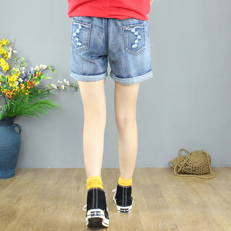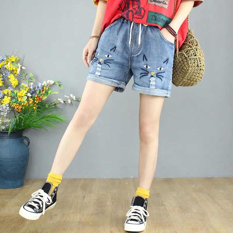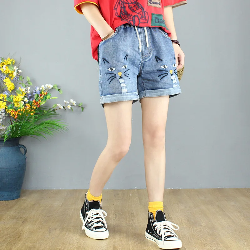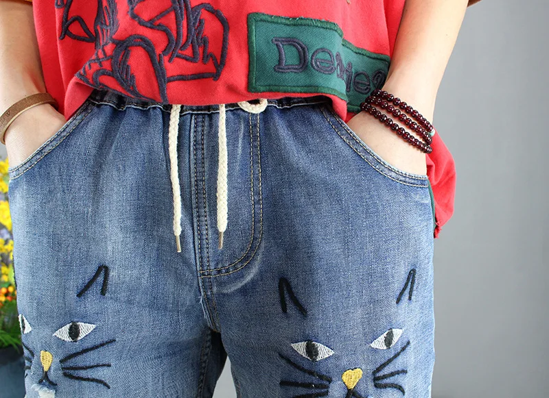 Женские винтажные джинсы с вышивкой кота, рваные хлопковые джинсовые шорты, повседневные женские джинсы на шнуровке с эластичной талией, синие джинсы mujer размера плюс