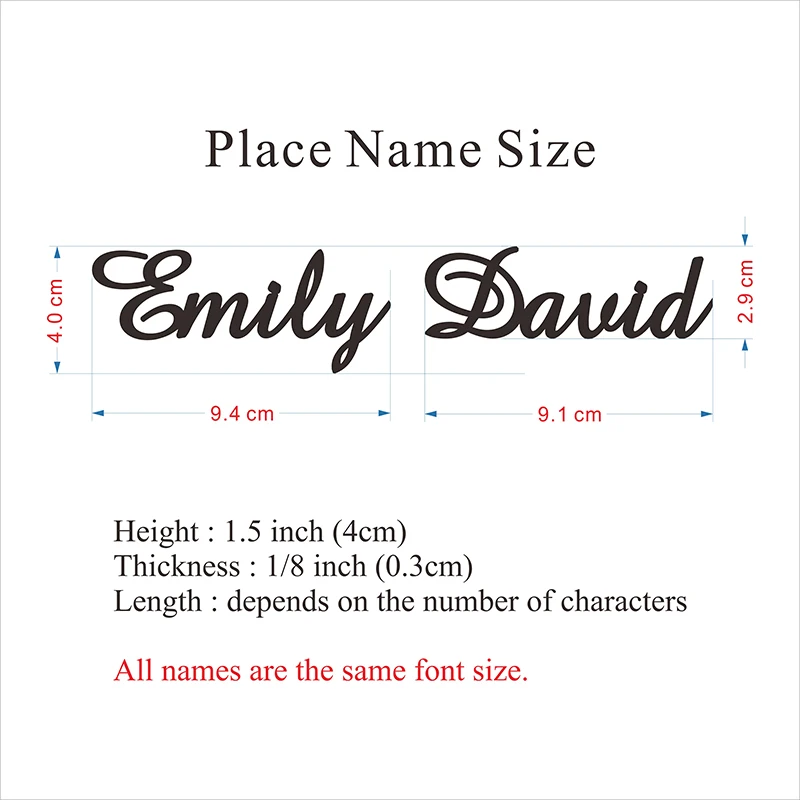 Описание товара Категория: украшения стола Материал: 3 мм толщиной акрил/дерево Высота: 4 см Длина: зависит от количества символов Советы: при оформлении заказа, пожалуйста, отправьте свой список имени через примечания к заказу или сообщение. --- Персонализированная Описание ---------- Мы разработаем его для вас, используя тот же шрифт, что и на фото дисплея. Пожалуйста, выберите количество и цвет, которые вам нужны, и мы создадим имя каждого гостя для вас. Поместите его в тарелку или тарелку стола или в другое место, которое вам нравится, это займет место обычной карты, чтобы показать вашему гостю, где сидеть. Название места используется для дня рождения, помолвки и свадьбы, детского душа, деловых мероприятий, ужина и других мероприятий. Если вам нужен другой цвет или другие пользовательские требования, пожалуйста, свяжитесь с нами, мы можем произвести как можно больше наименований лазерной резки, как вам нужно. Чтобы оставить свои данные при оформлении заказа, пожалуйста, используйте следующий формат и заполните соответствующие детали. Например: Ромашка Sabrina Charlotter Если вам нужен другой цвет или другие пользовательские требования, пожалуйста, свяжитесь с нами, мы можем произвести как можно больше наименований лазерной резки, как вам нужно.