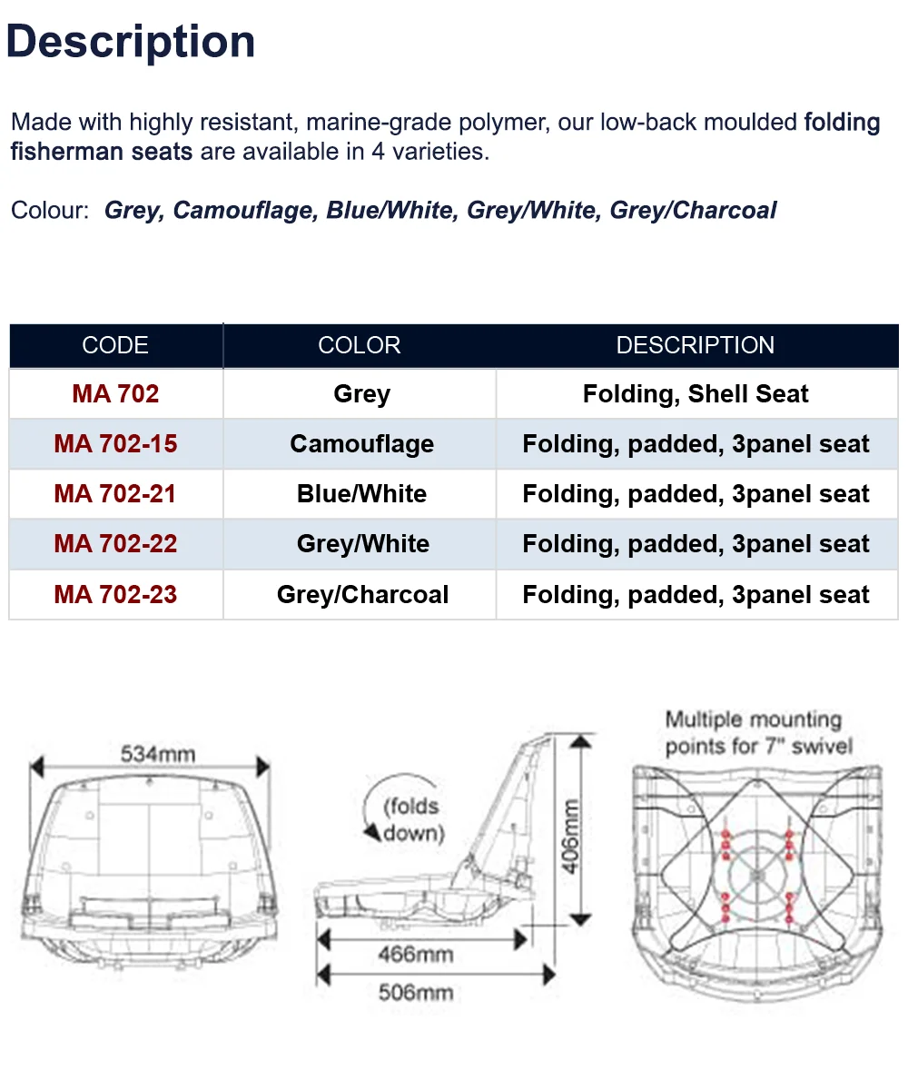 Сделано с высокой устойчивостью, морской-высококлассная полимерная, наши низкой спинкой литые Складные в рыбацком стиле мест доступны в 4 вариантах. • Удобные Толстые формованные пены подушки. • Устойчивы к ультрафиолетовому излучению ткань OMNOVA. • Большой для покрытия алюминиевым порошком петли. • Костюмы типа 7 военного образца ″ Вертлюги или Titan шарнирного соединения. • Сверхпрочный литой пластиковый внутренний каркас. Цвет: серый, камуфляж, синий/белый, серый/белый, серый/темно-серый
