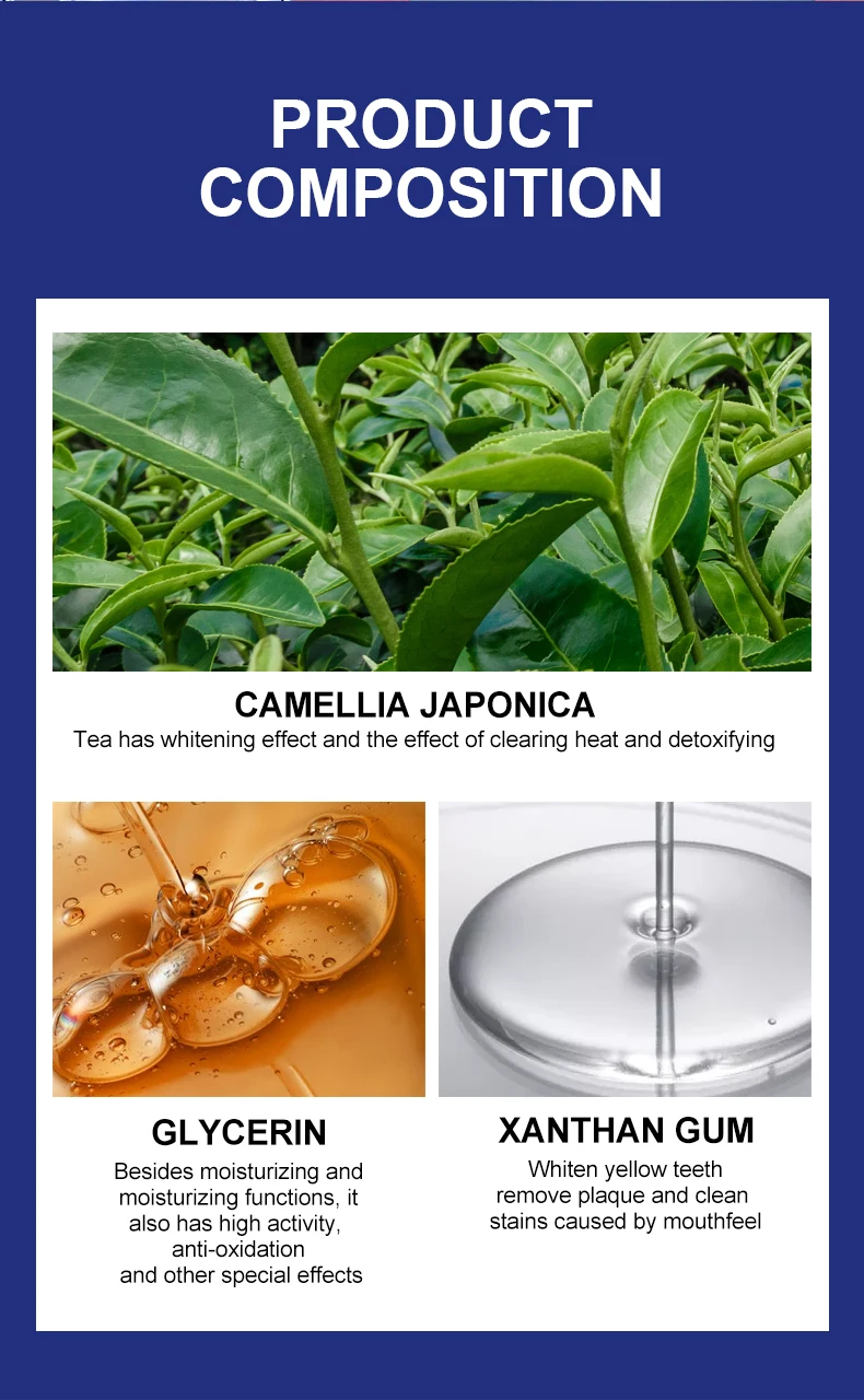 Содержит различные растительные экстракты, такие как Камелия, для удаления пятен, вызванных курением, питьем чая или кофе, отбеливанием желтых зубов, удалением налета и совершенно чистым вкусом.