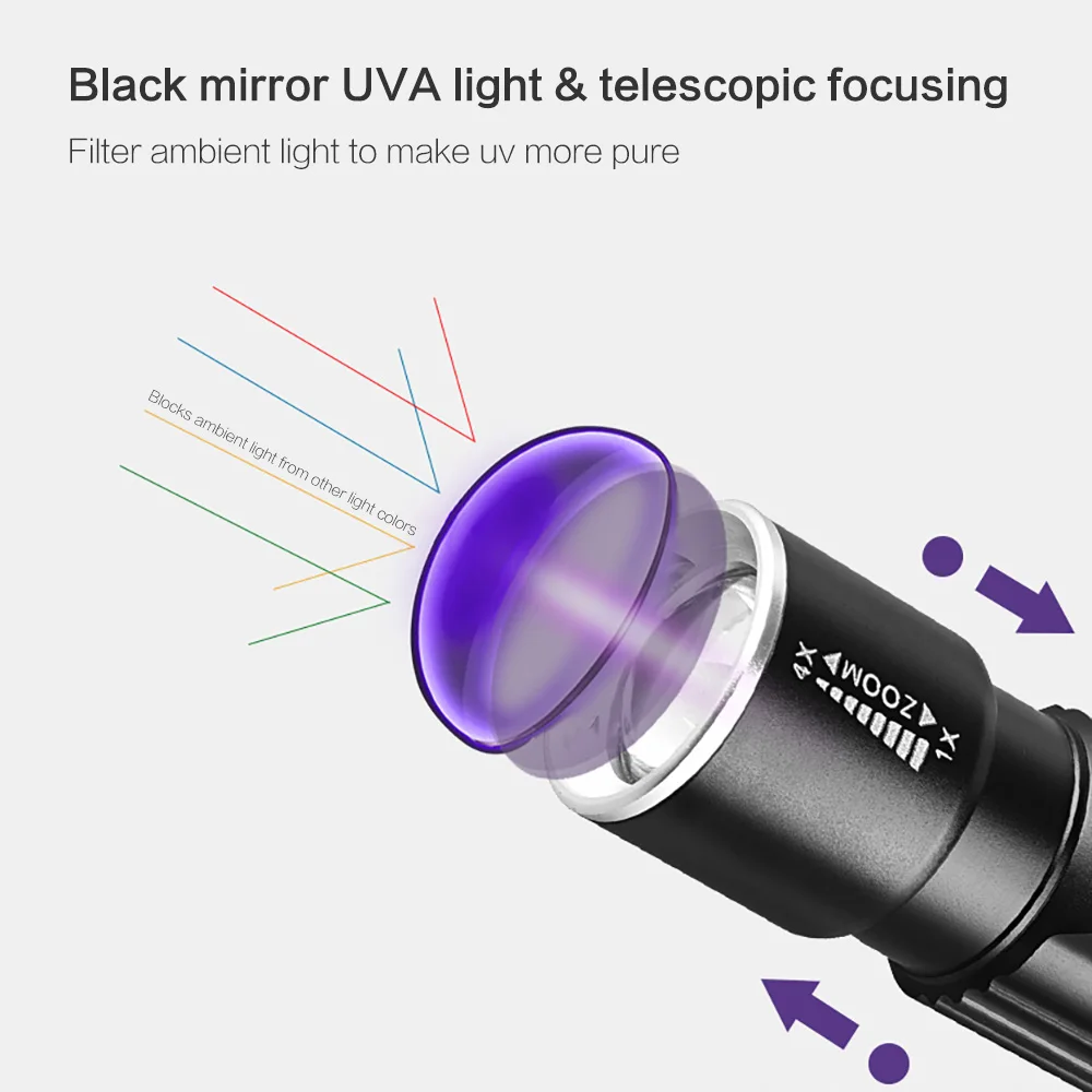 Фиолетово-светильник вспышки светильник разработан с Мощный УФ НУВ 365nm светильник источник, что может привести к тому, что вы сильный светильник поддержку. Есть три светильник режимов для вас на выбор, включая сильный светильник режиме слабый светильник режим и мерцающий светильник режим, совместимый с разных ситуациях.