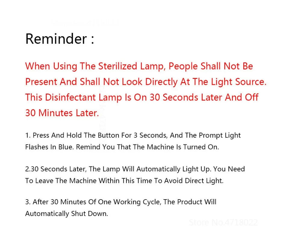 Информация о продукте. 1. Пресс и удерживайте кнопку в течение 3 секунд, индикатор светильник мигает синим цветом. Напоминаем, что машина включена. 2. Светильник автоматически включается через 30 секунд. Вы должны оставить машину в течение этого времени, чтобы избежать прямой светильник от лампы. 3. После 30 минут одного рабочего цикла продукт автоматически отключится.