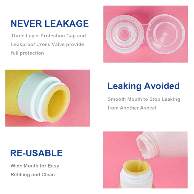 Тройная герметичность: бутылки для туалетных принадлежностей для путешествий были спроектированы с 3-слойным покрытием, защищенным от протечек и полости в форме звезды, что предотвращает утечку жидкости или проливание. Эти наборы для шампуня и лосьона для путешествий обеспечивают защиту вашего багажа и одежды.