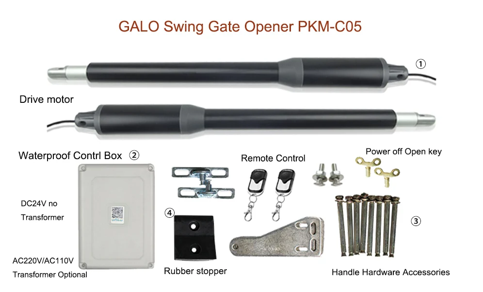 ① 2 * открывания ворот (приводной двигатель) ② 1 * блок управления (с трансформатором) ③ 1 * набор аппаратных аксессуаров ④ 1 * резиновая пробка ⑤ 2 * пульт дистанционного управления ⑥ 1 * руководство на английском языке Дополнительные аксессуары, выберите комплект цветов, показанный на фото В некоторых странах холодный климат, мы добавляем антифриз масло внутри двигателя, он может работать в холодной среде.