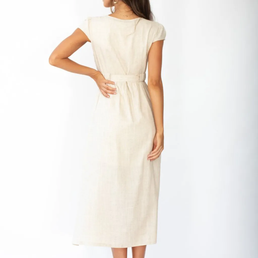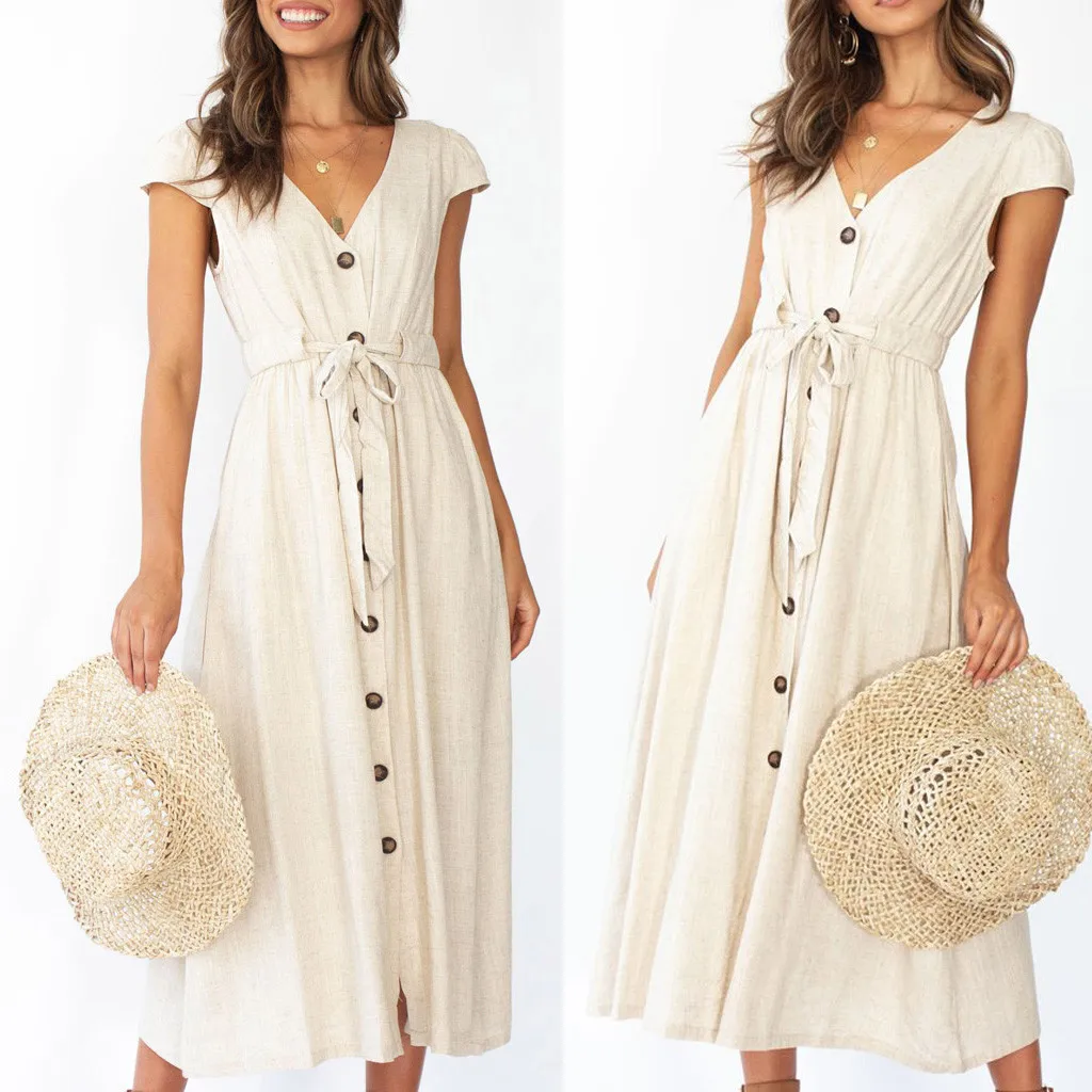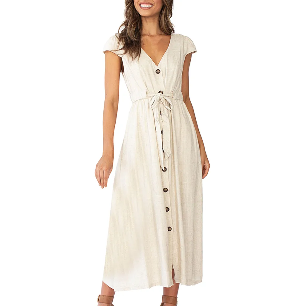 Женское летнее платье с короткими рукавами и v-образным вырезом на пуговицах