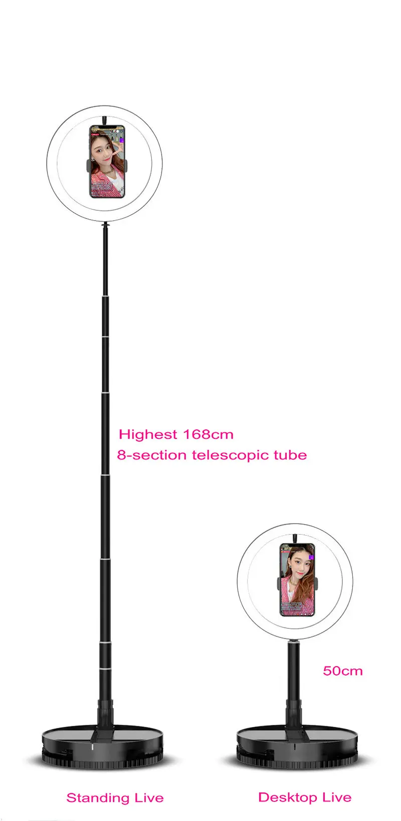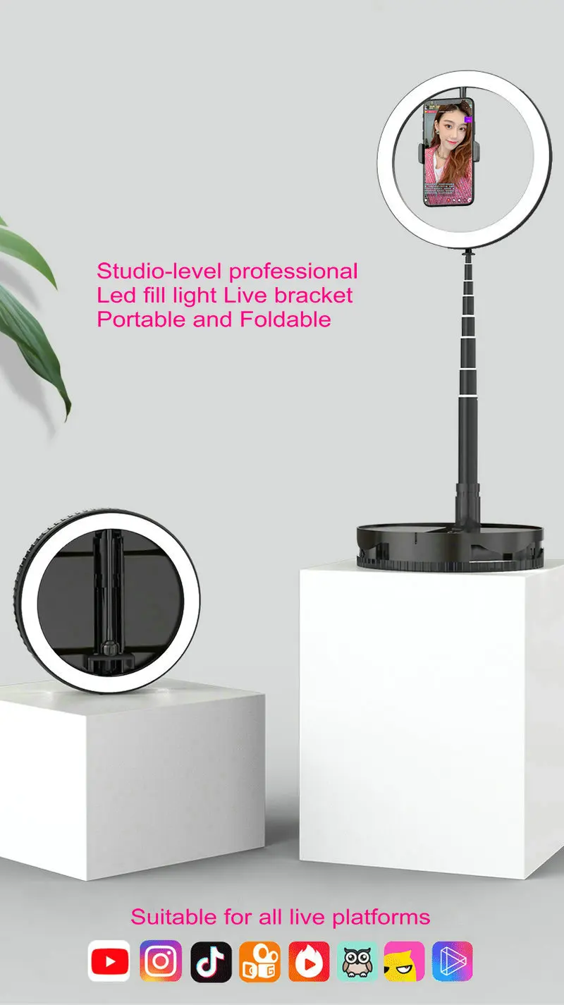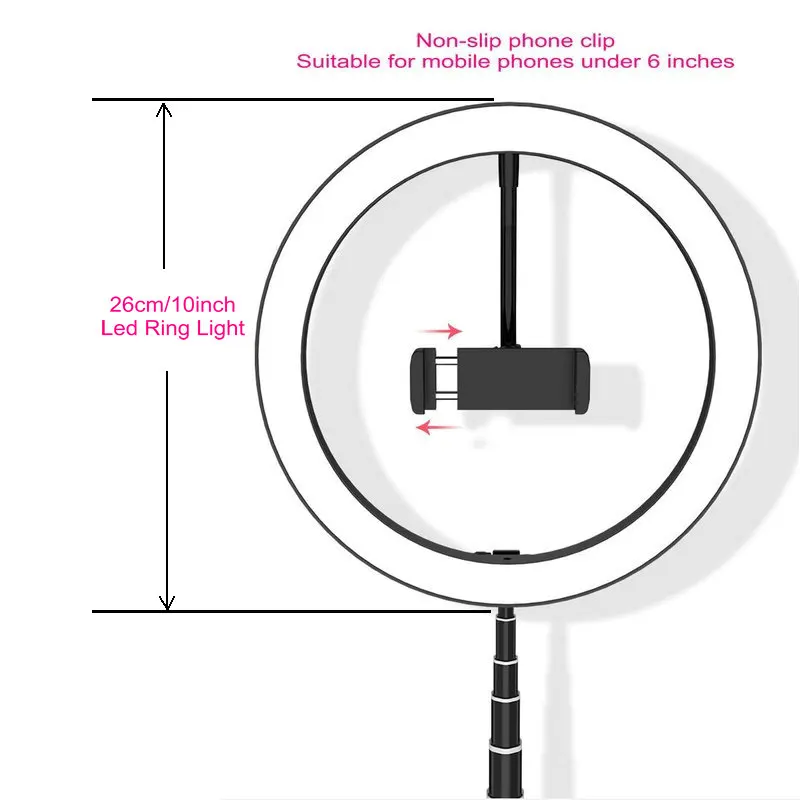 10 дюймов выдвижной LED заполняющий свет кронштейн селфи кольцо свет с зажимом для телефона Youtube видео Live Beauty Studio для iphone samsung huawei Параметры продукта: Размер продукта: 265x265x66мм Высота изделия: 168 см Основной материал: алюминиевый сплав + ABS Количество втягиваний: 8 втягиваний Светильник Цвет: белый, теплый белый, натуральный (теплый белый свет) Светильник: 10 передач Комплектующие для баллотиков: 160 светодиодный Highligt баллоты Светильник температуры бусин: 3500-6000K Мощность лампы: 12-24 Вт Напряжение освещения: 5 В Шаги операции: 1. В сложенном состоянии деформация линии управления на основании, а затем открыть кронштейн; 2. Откройте кронштейн в направлении стрелки; 3. После открытия кронштейна Отрегулируйте угол до 90 градусов по вертикали, затем Зафиксируйте ручку Устройство с фиксированным углом по часовой стрелке. Когда используется устройство блокировки основания, нажмите его вниз и Затяните его; 4. Запорный винт за заполняющим светильник должен быть затянут по часовой стрелке; 5. Кронштейн может быть отрегулирован на 180 градусов вверх и вниз. 6. Кронштейн можно регулировать по высоте, а уровень можно слегка натянуть во время использования; 7. Храните 1, поверните ручное устройство против часовой стрелки; 8. Храните 2, ослабьте ручное устройство и снимите кронштейн после того, как труба будет на месте.
