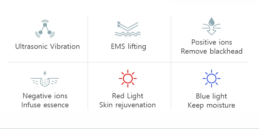 1. Красная и синяя светотерапия 2. Ультразвуковая высокочастотная вибрация 3.EMS микротоковая подтяжка лица 4. Положительные ионы-удаление черных точек 5. Отрицательные ионы-эссенция
